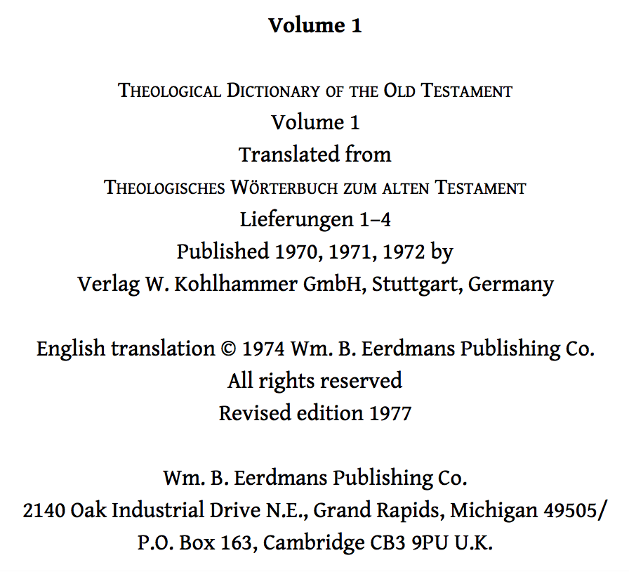 TDOT is an English translation of the 15 volume Theologisches Wörterbuch zum alten Testament. The English translations have followed the German publications relatively quickly, unlike the New Testament counterpart TDNT, which was published in German in the 1930s and didn’t begin to be translated until the 1960s . You can see the publication information concerning the first and fifteenth volumes of TDOT below: