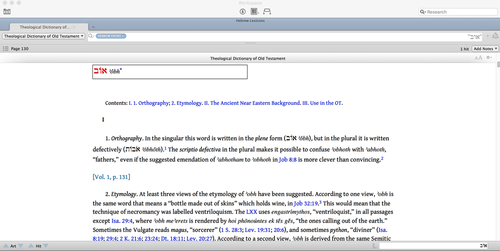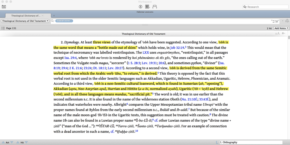 This is where TDOT can come to the aid of everyone from students to pastors to scholars. Below you can see the beginning of the entry for אוֹב and the etymology section in TDOT.