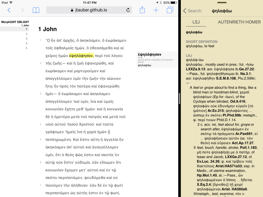 I just discovered the Bible Web App. Its appearance is similar to MorphGNT — super stripped down and clean. One added benefit of this site is that you can click on a word and get basic lexical help. One shortcoming: the words are not fully tagged. As you can see below, all you get for ψηλαφάω is “verb.”