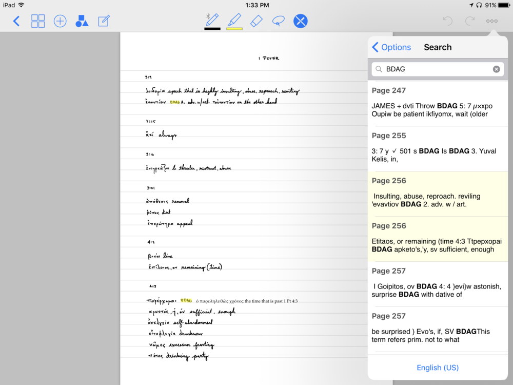 GoodNotes is the distinctive feature. GoodNotes allows me to reap all the benefits of taking notes by hand, while simultaneously storing my notes in a digital platform I can access anywhere. The cherry on top is that GoodNotes automatically recognizes the text of your notes — even cursive — and you can search them. Unfortunately, it does not recognize Greek or Hebrew, but what app really does a halfway decent job with that apart from ABBYY FineReader. It would be unreasonable to expect GoodNotes to turn handwritten Greek or Hebrew into digital text, but one can dream.