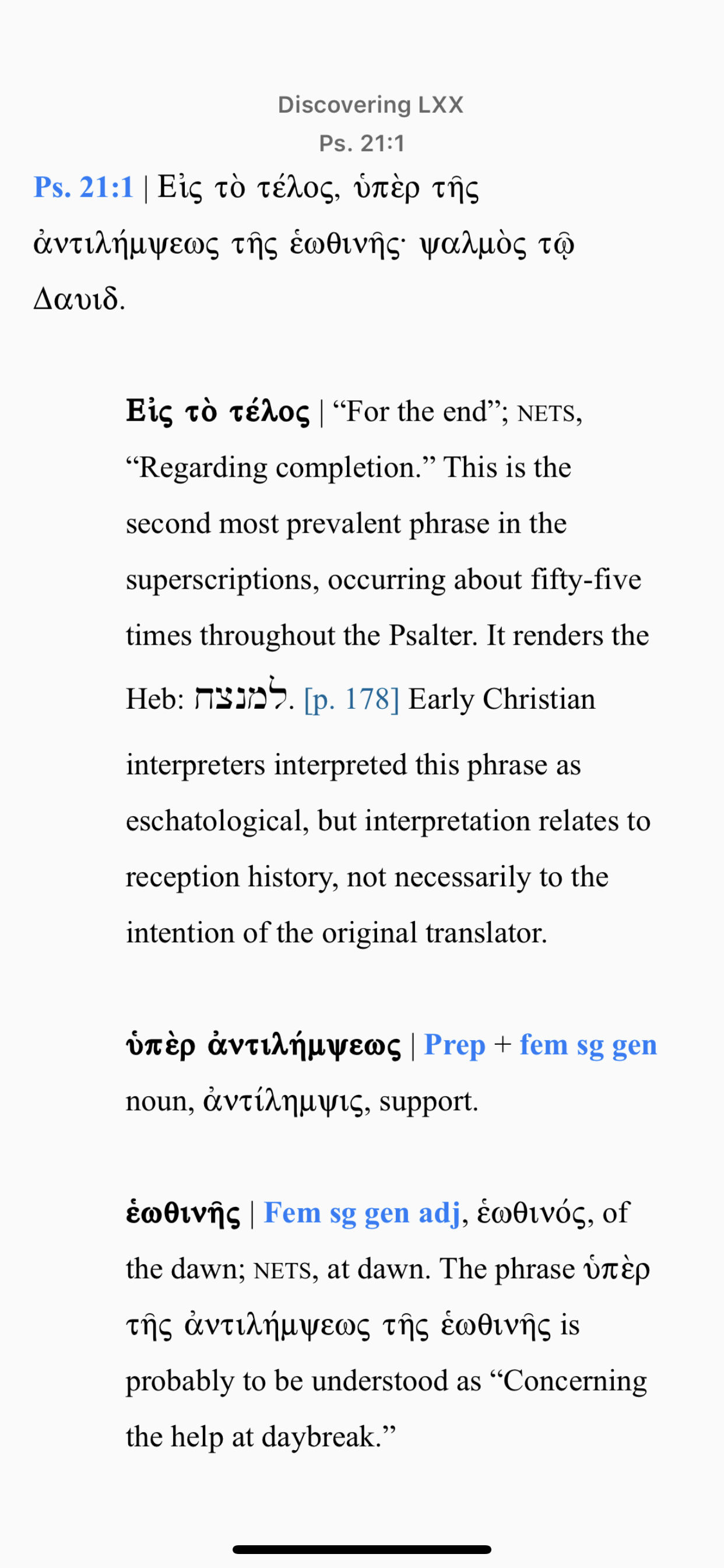 I also appreciate how the editors comment on how certain LXX passages are used in the New Testament. Here is a screenshot of a chart that appears at the end of the Psalm 21 passage. I long-held on one of the hyperlinked NT passages to have the NT passage popup.