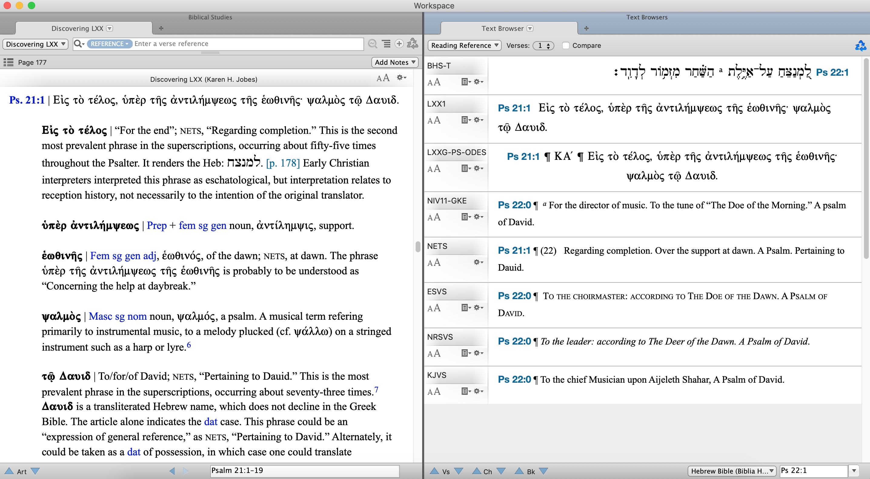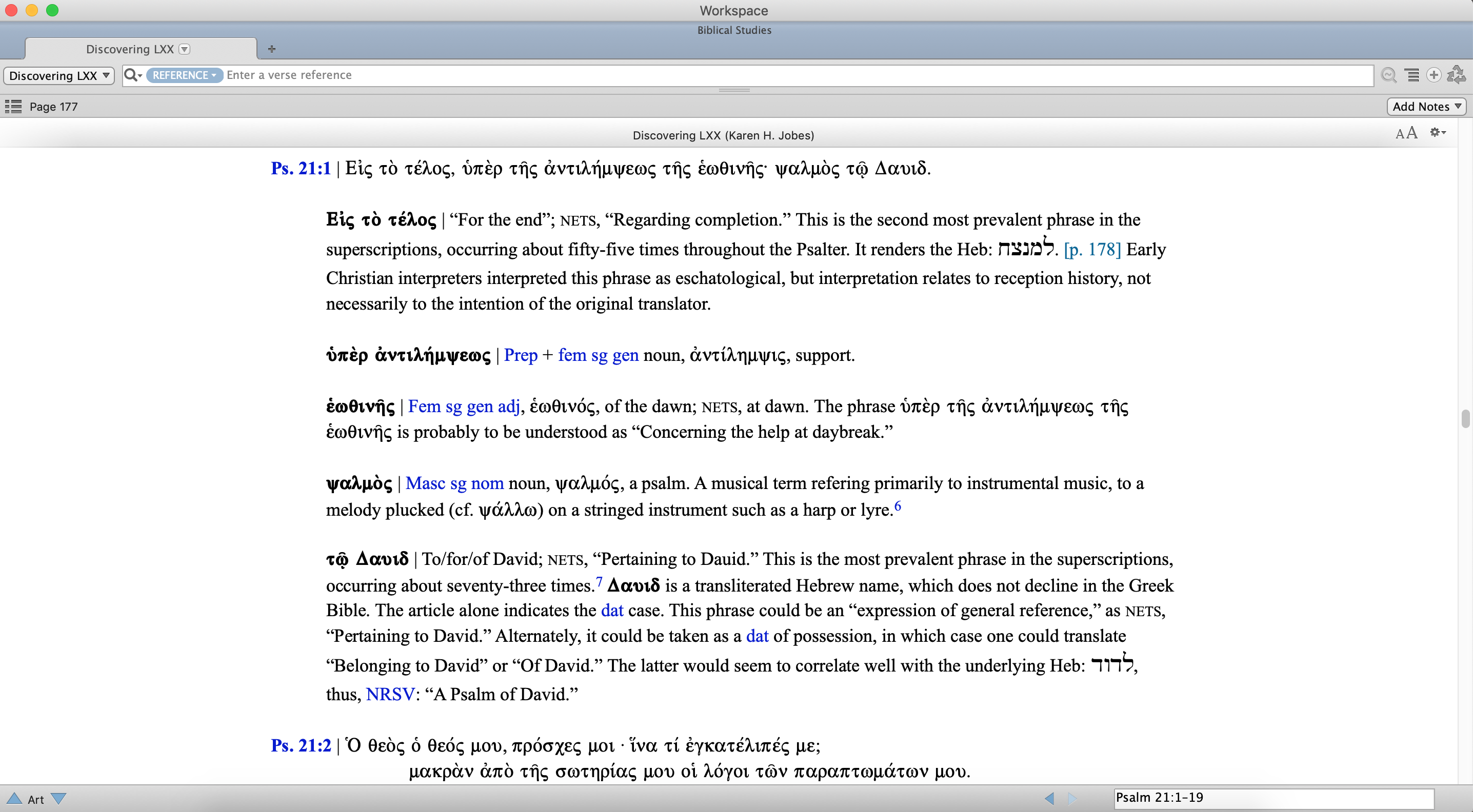 I do, however, wish the individual verses were morphologically tagged. Since the Septuagint text is from Rahlfs and Accordance has a fantastic tagged Rahlfs text, I hope morphological tagging will be added to each verse in a future update. Having the text tagged, even if Accordance had to charge a little extra, would greatly increase the value and usefulness of the electronic edition.