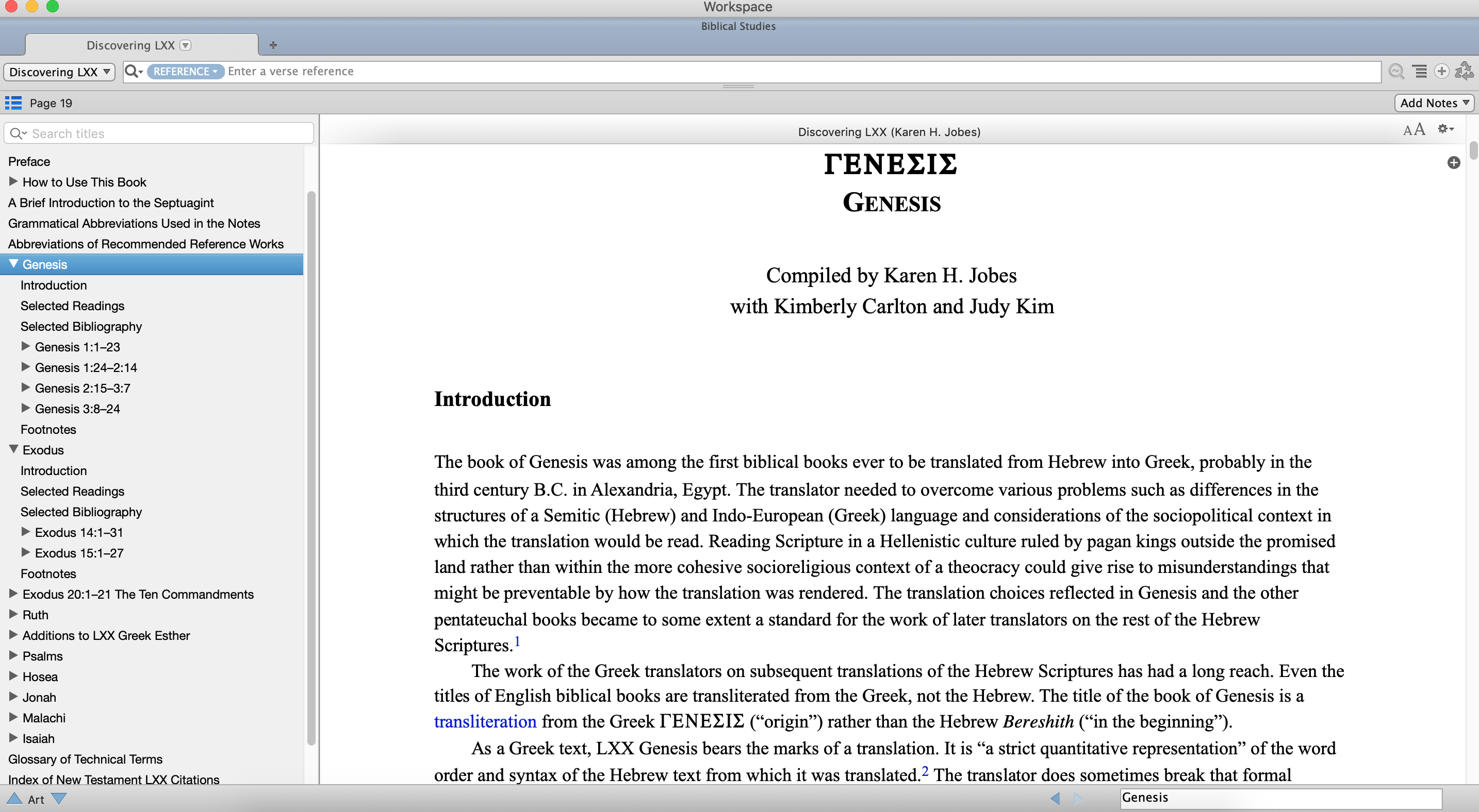 Every portion of the print book is included in the Accordance edition of DLXX. As the picture above shows, the table of contents pane, which can be shown or hidden, allows you to easily navigate to all the front and end matter and each passage in between.