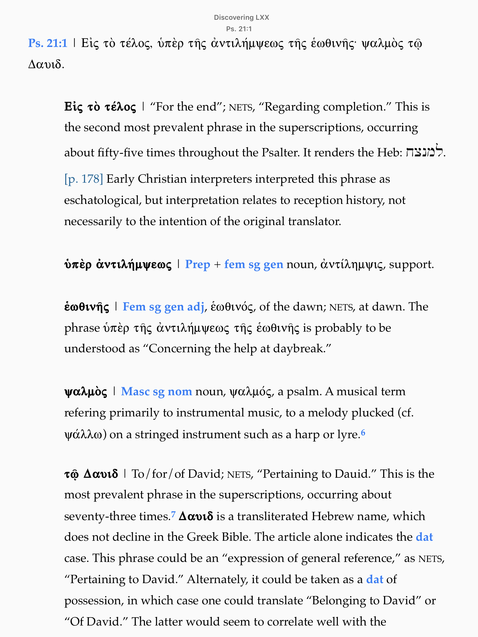 There is nothing exactly like Discovering the Septuagint: A Guided Reader (DLXX). This resources is aptly titled because it isn’t just a “reader’s edition.” It is a guide to reading the Septuagint. Reader’s editions of the Bible typically provide only vocabulary and parsing helps. Working through DLXX is like sitting down and reading with someone that has experience. As you read together, a whole host of topics are covered. The majority of the conversation focuses on what you need most, vocab and parsing helps, but there are also comments that speak to the underlying Hebrew, comments about the similar uses of words or phrases in other LXX passages, comments related to syntax, suggestions for translation, and more. Despite the fact that Hendrickson published a full, two-volume Septuagint Reader’s Edition this month, the variety of comments offered in DLXX makes it a unique, helpful resource for students who have only a little experience reading Greek.