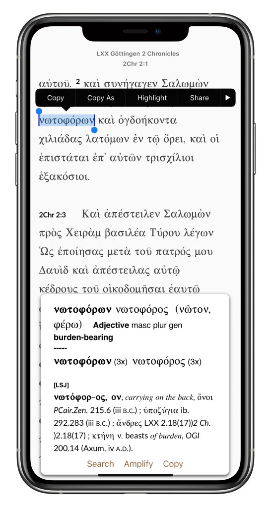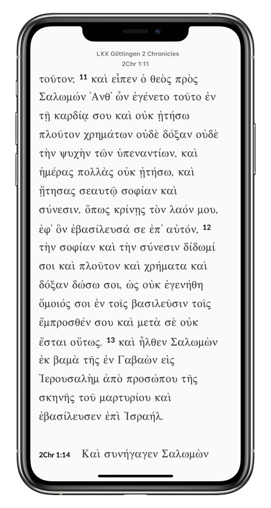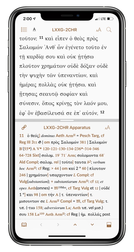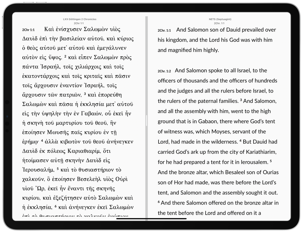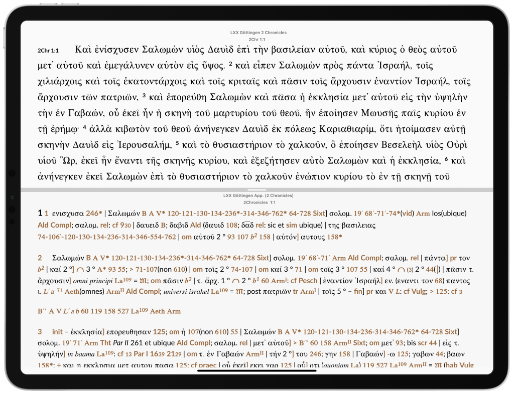 In this section, I just want to share some screenshots of what the 2 Chronicles volume looks like on iPad OS. There will be another post that continues my “Ways of Reading” series, and in that post I’ll talk about reading Göttingen 2 Chronicles on the iPad and using a print lexicon.