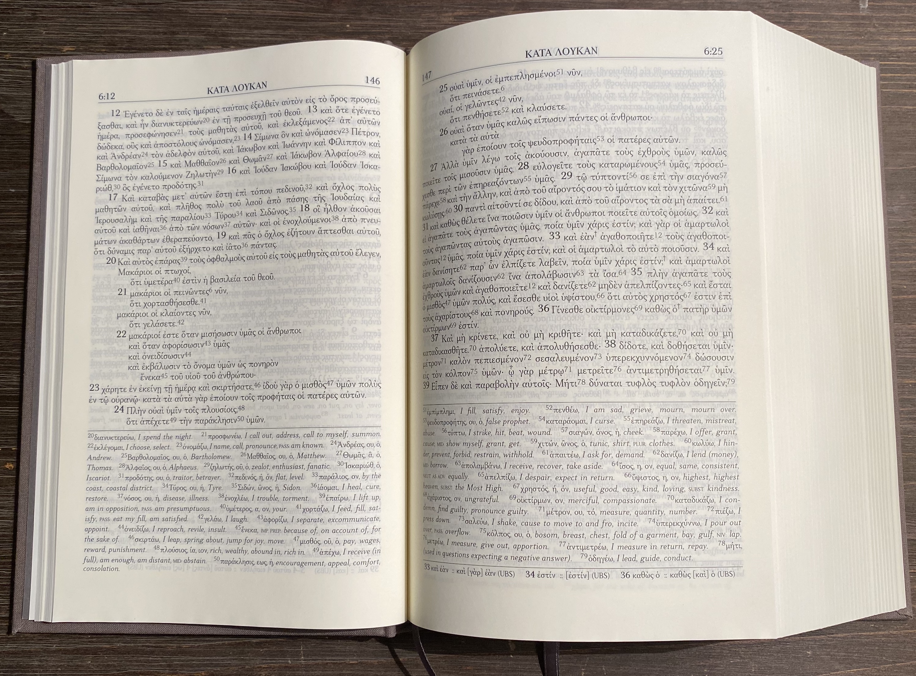 The second edition, relased in 2007, was a huge improvement, but in that same year UBS released a reader’s edition with larger, more readable font, and a two coloumn footnote layout. The text of the UBS edition also had the advantage of being that of UBS4, whereas the Zondervan text is reconstructed text based on the editorial decision of the committee behind the NIV. I don’t really care about the issue of what text is included, I just want the font to be easy on the eye.