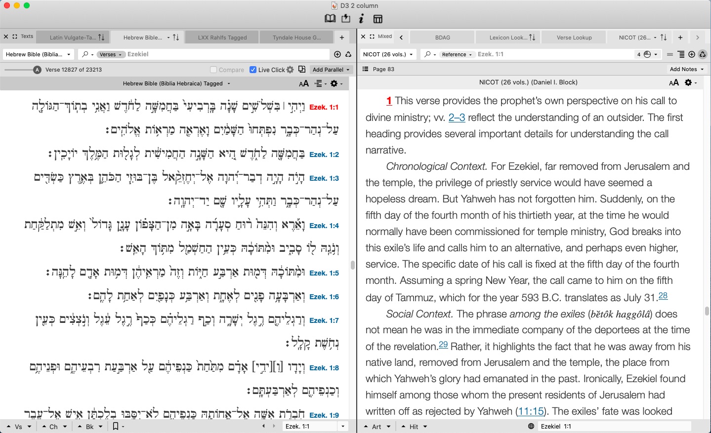 One of the easiest ways to access NIC in Accordance is to simply triple click on a Bible verse reference to amplify straight to the commentary. On MacOS, a triple click on Ezekiel 1:1 takes you directly to volume one of Daniel Block’s fantastic Ezekiel commentary. This is yet another example of a magnum opus in the NIC series.