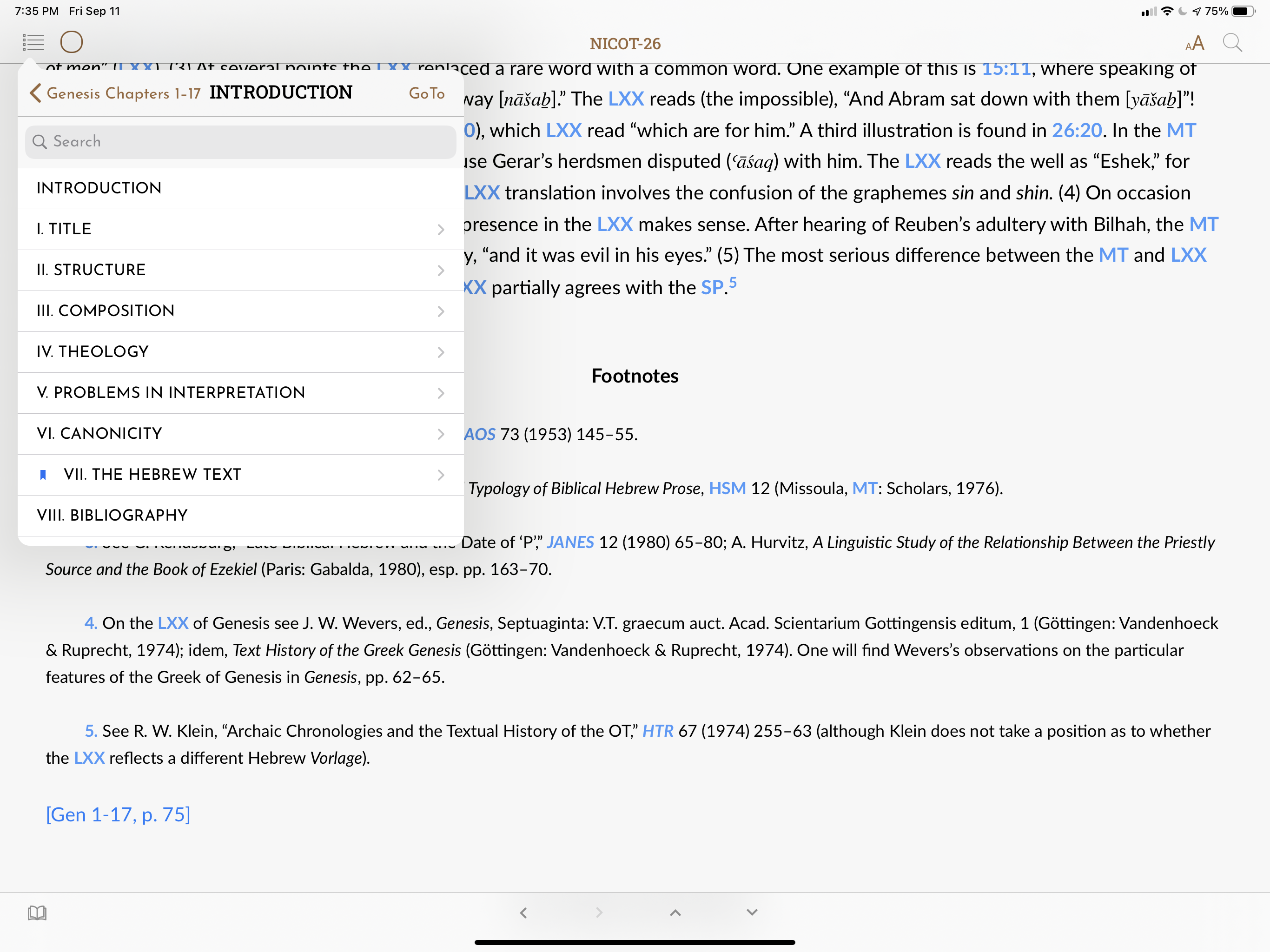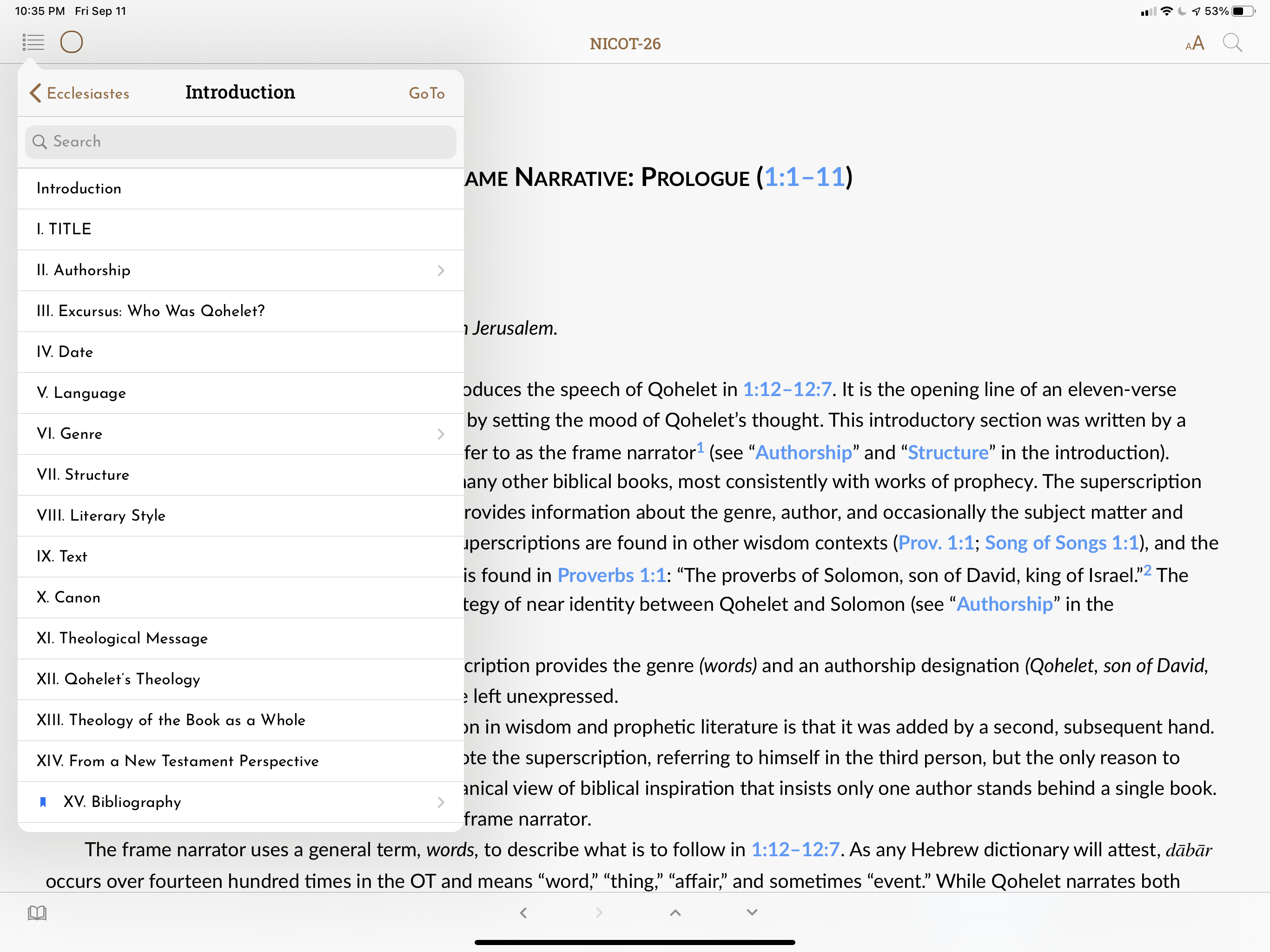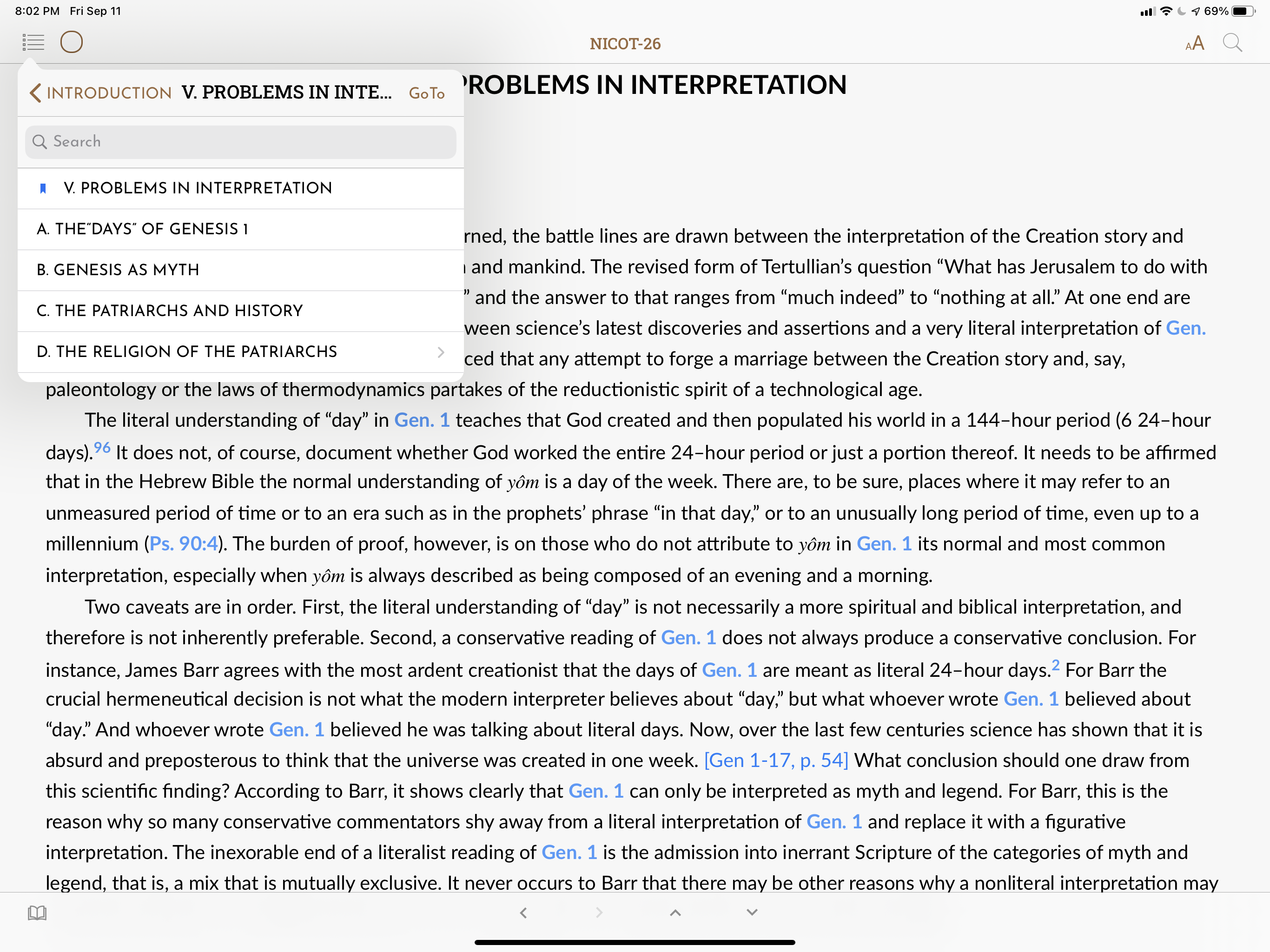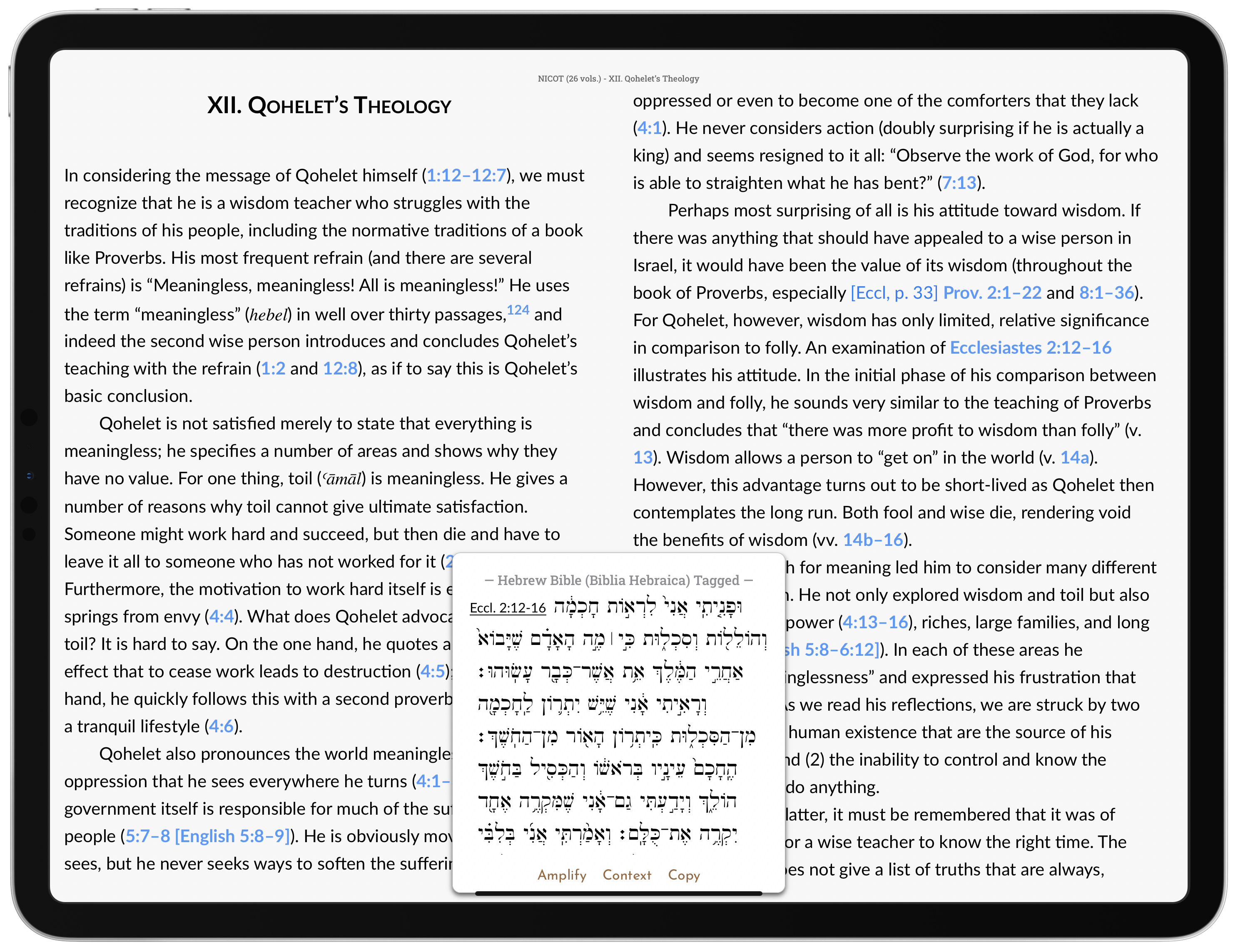Reading through an introduction like this in digital format is ideal on an iPad. The iPad screen provides plenty of space for reading with Accordance’s multi-column view and clicking on references to look at the text in the original language.