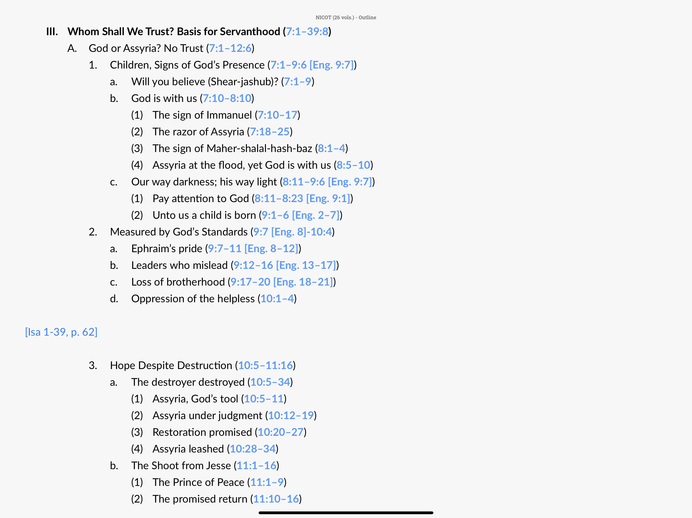 With a book like Isaiah, it is often difficult to track with the flow of the discourse. Apart from the rich commentary itself, I have regularly benefitted from Oswalt’s detailed outline of the Isaiah. The outline itself spans five pages.