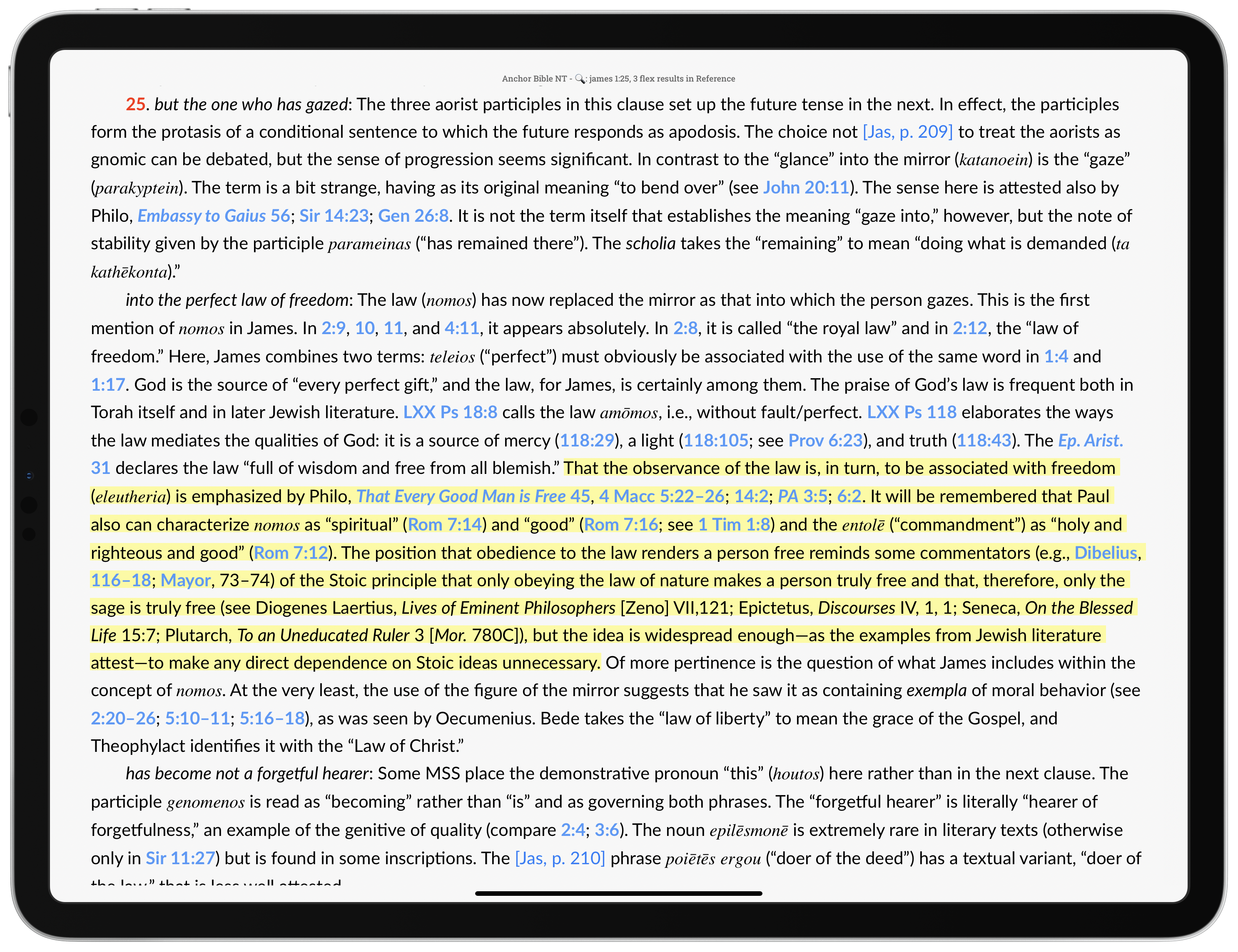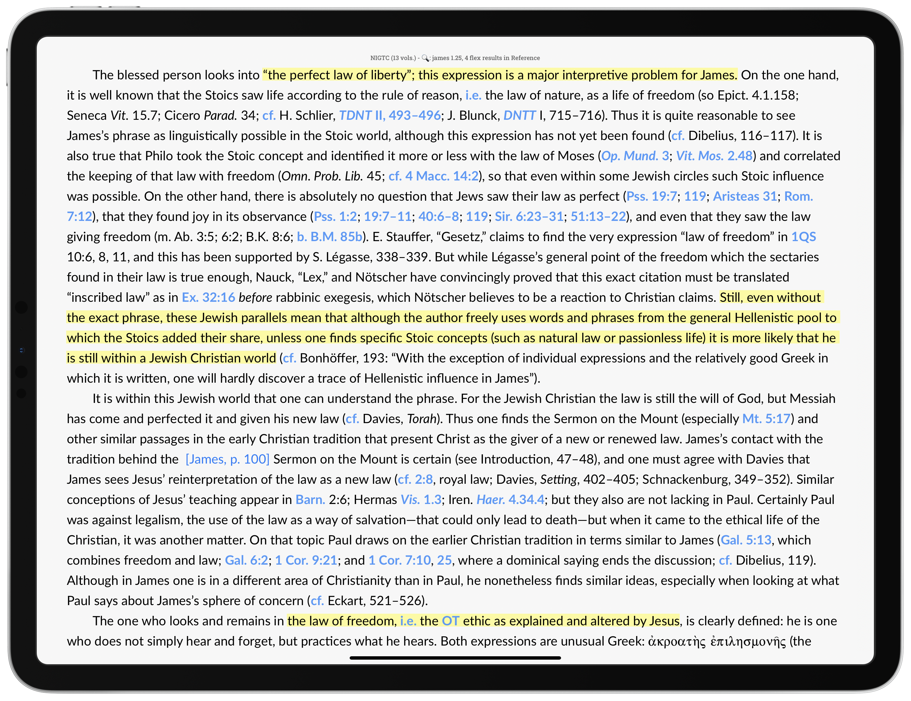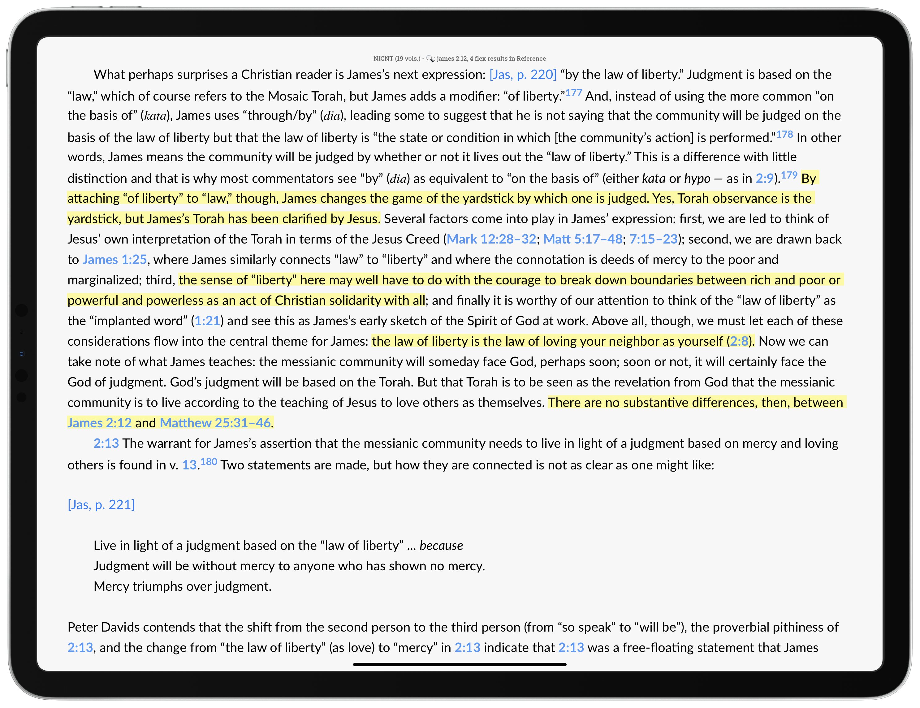 Davids, too, devotes more attention to the issue at 1:25. There, he has about a page surveying the interpretive options, whereas McKnight had four pages. Instead of citing and discussing the key passages, Davids merely provides parenthetical lists of references. His conclusion is that “law of liberty/freedom” should be understood as “the OT ethic as explained and altered by Jesus.”