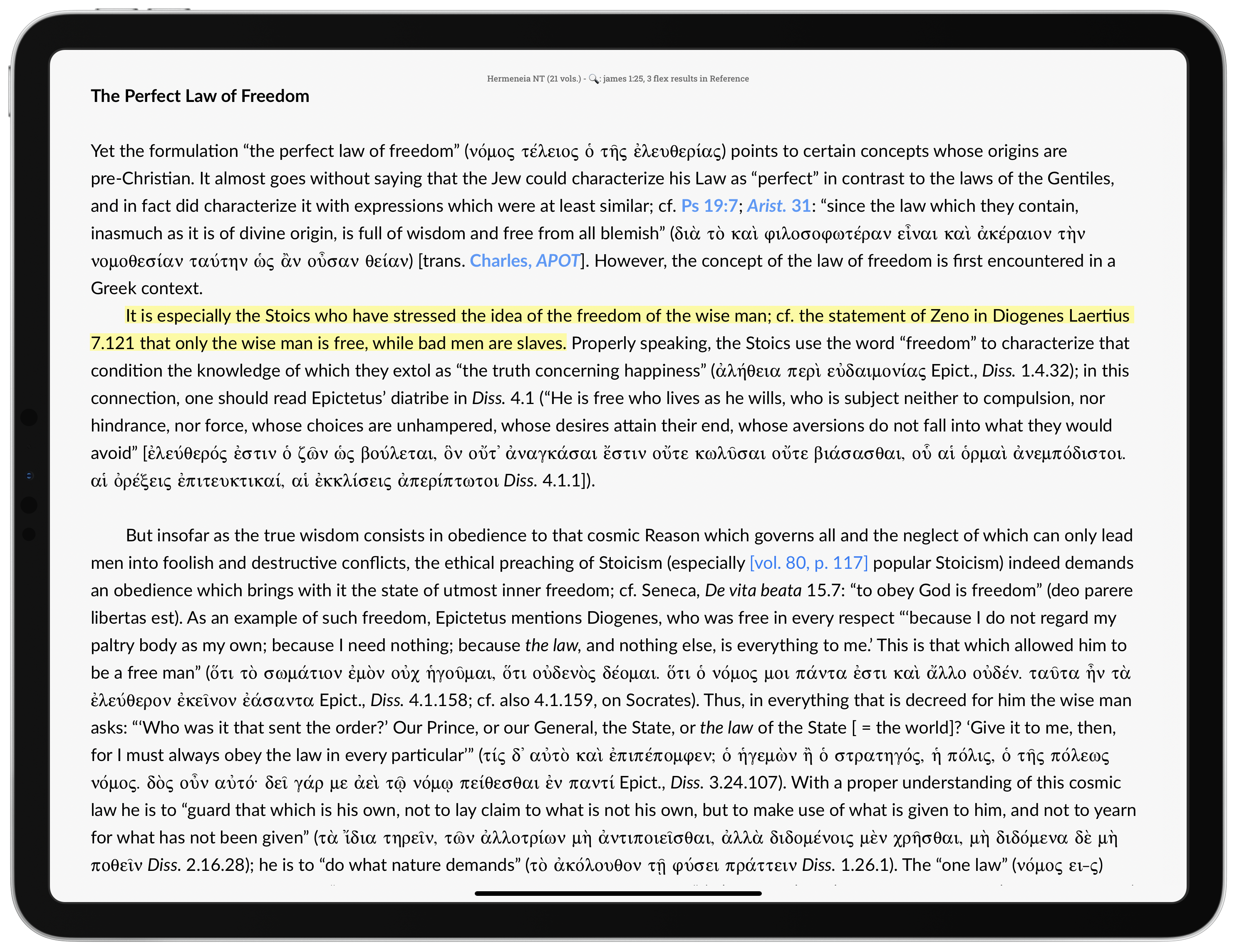 The position that obedience to the law renders a person free reminds some commentators … of the Stoic principle that only obeying the law of nature makes a person truly free and that, therefore, only the sage is truly free … but the idea is widespread enough—as the examples from Jewish literature attest—to make direct dependence on Stoic ideas unnecessary.