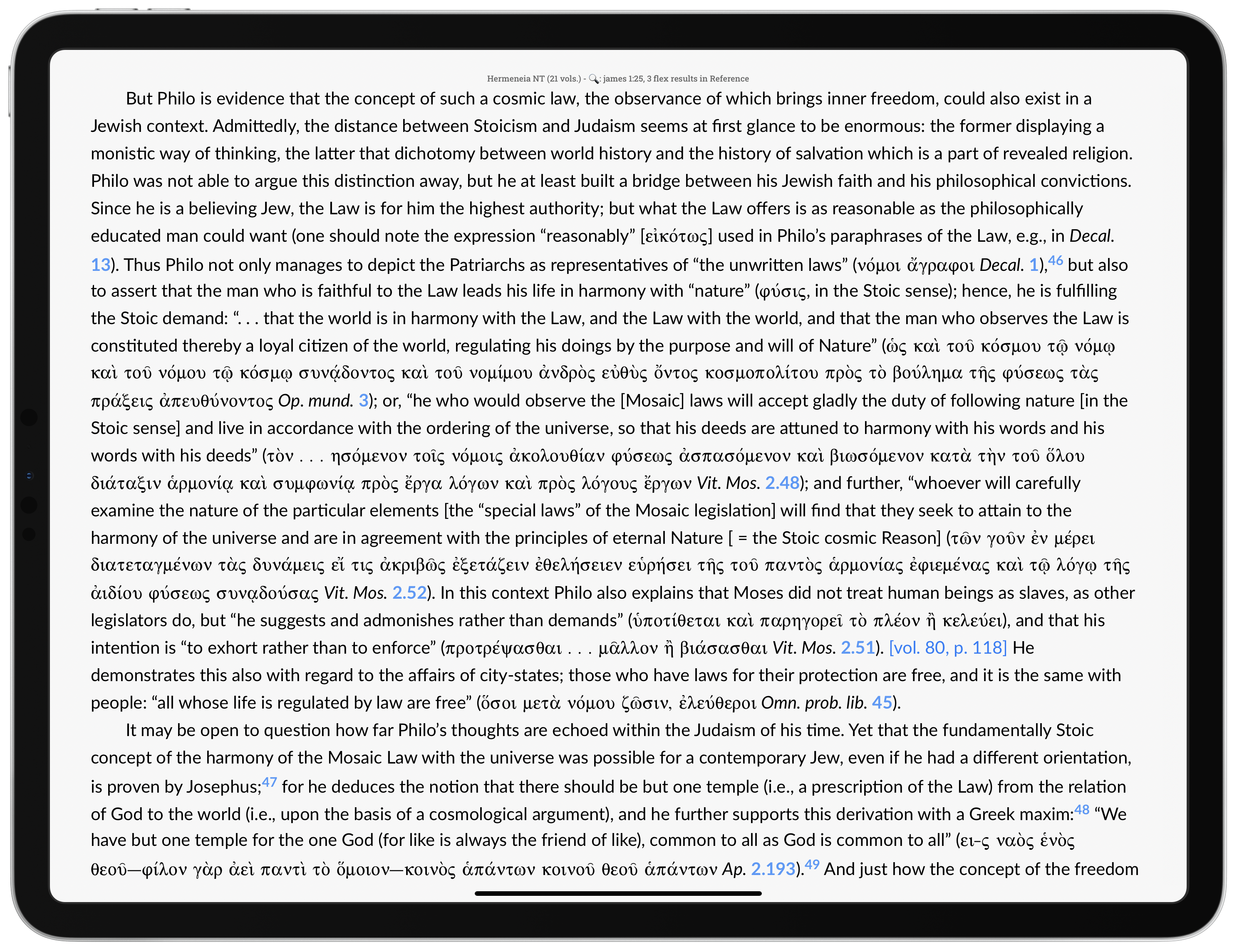 Of all the commentaries surveyed here, Dibelius provides the most throughout discussion of both the stoic context and that of Philo. When he cites ancient literature, he provides the key words in the original language and in translation.