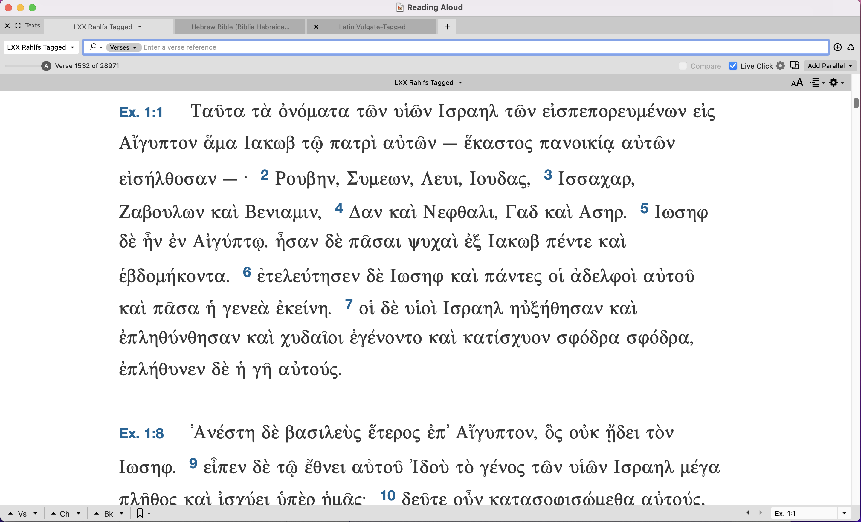 Finally, there are times when all I care about is seeing an easily readable text, and for those times I have a workspace called reading aloud. Here, I have the Septuagint, Hebrew Bible, and Vulgate open with the verses grouped into paragraphs.
