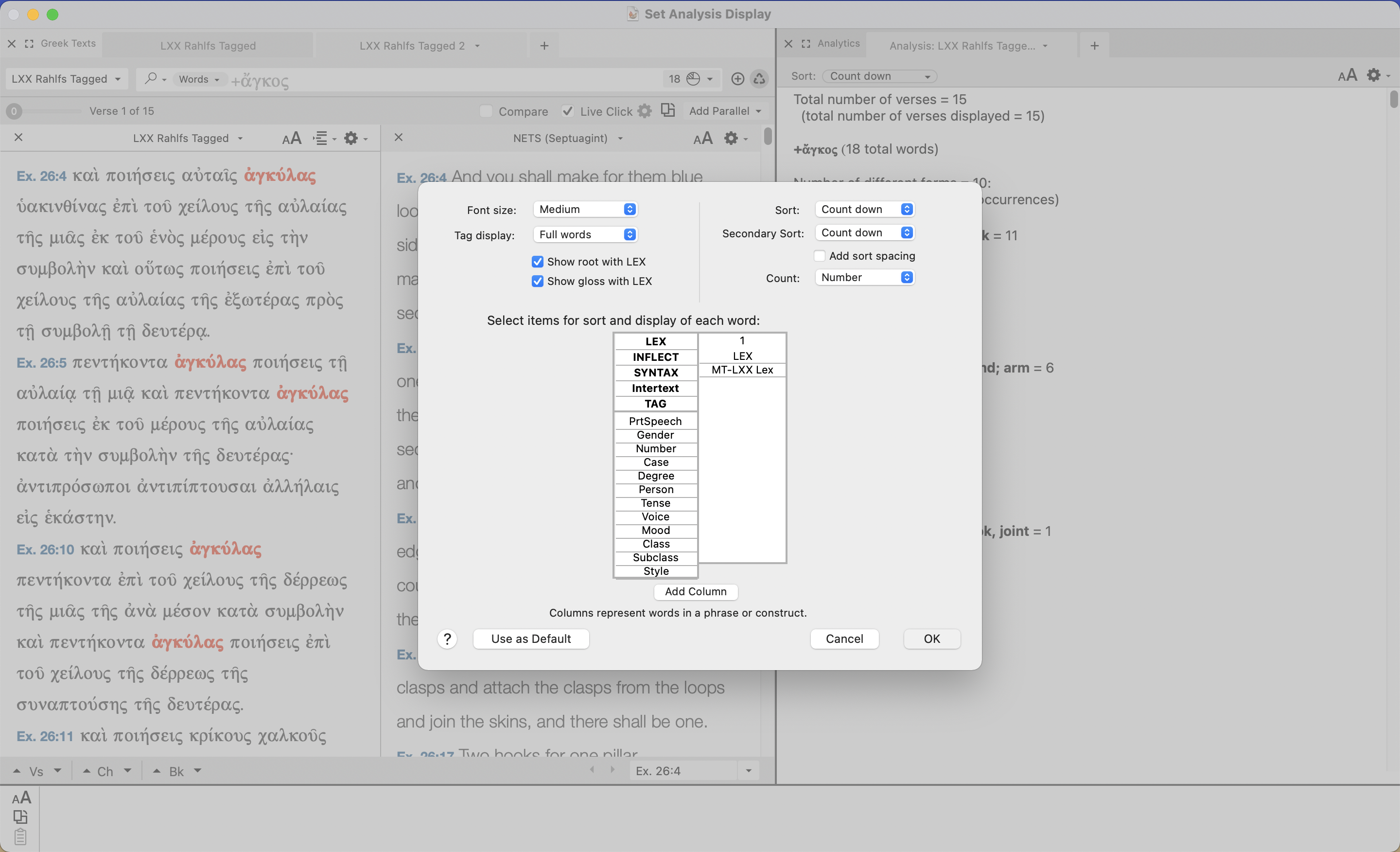 You see the Hebrew equivalents underneath each lexical form because my default Analysis display is set to show lexical forms first and then MT-LXX equivalents underneath. If I click on the gear icon in the Analysis tab, here’s what this looks like: