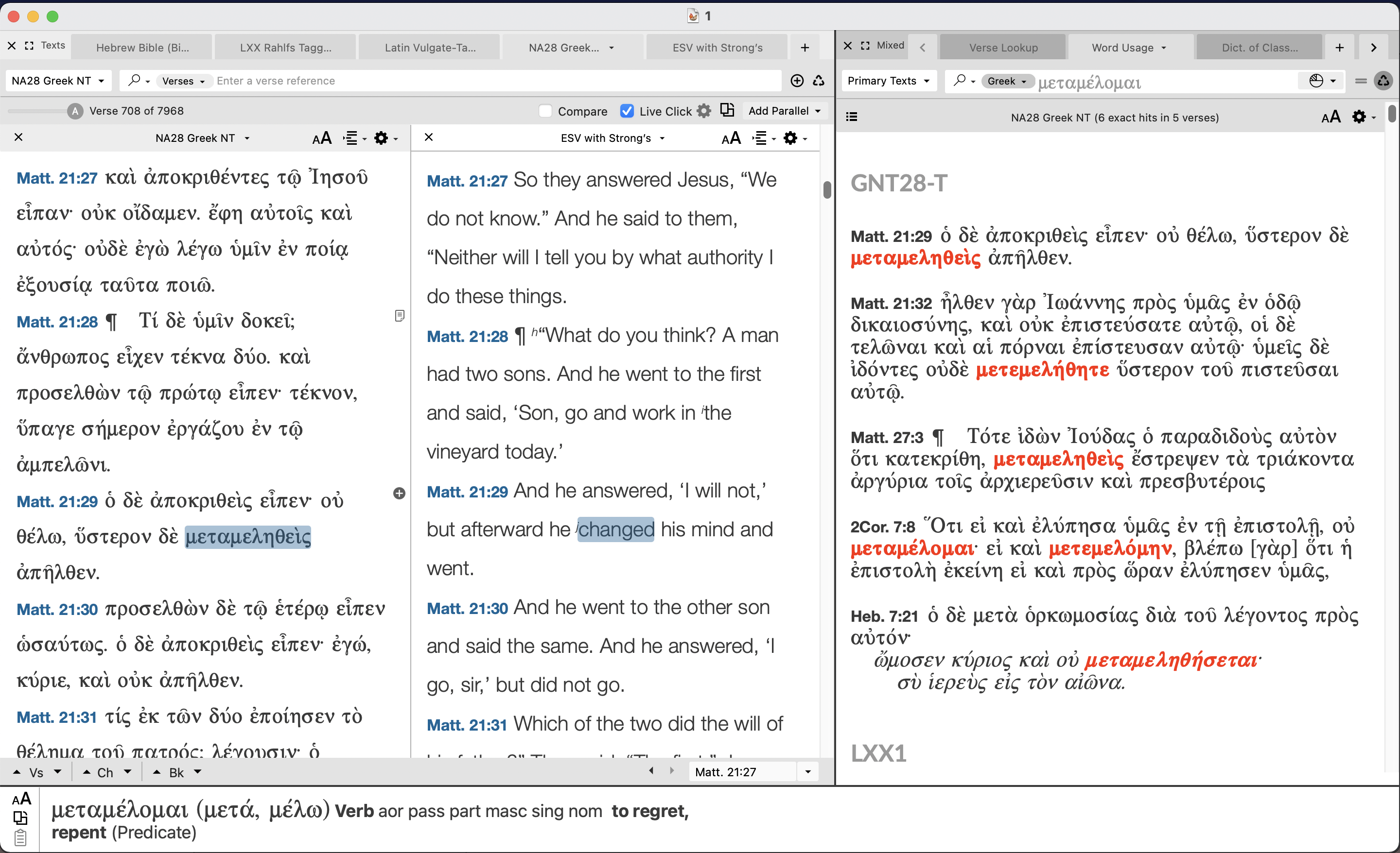Recently, I’m using this feature as much or more than triple-clicking for lexica or live-clicking a verse reference to see other ancient versions. Here’s a Greek example.