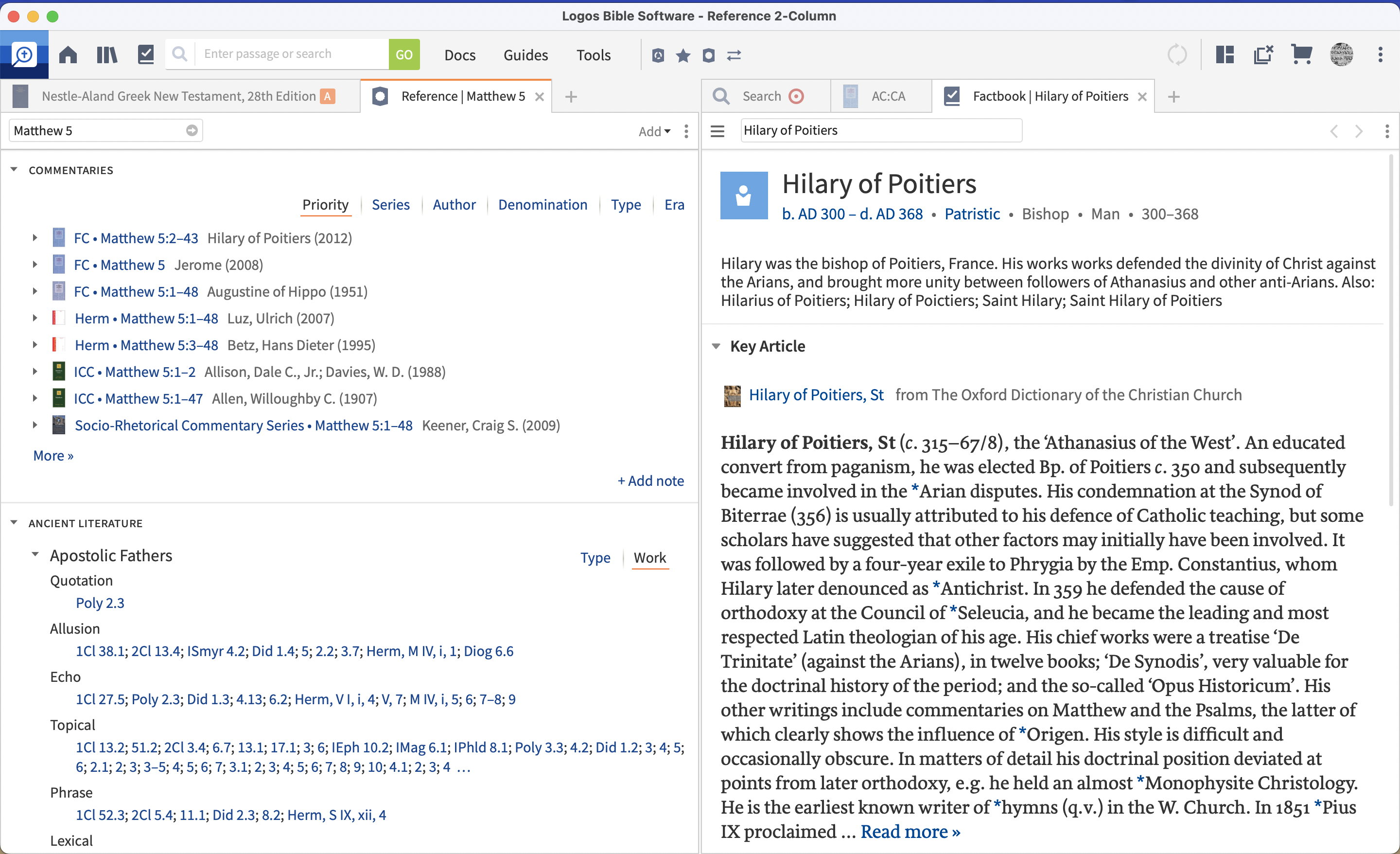 If you are not familiar with these ancient authors, Logos’s Factbook is a great place to start. For example, take a look at the Factbook entry for Hilary of Poitiers, whose commentary on Matthew shows up first in a passage guide for Matthew 5. The Oxford Dictionary of the Christian Church describes Hilary as “the Athanasius of the West.”