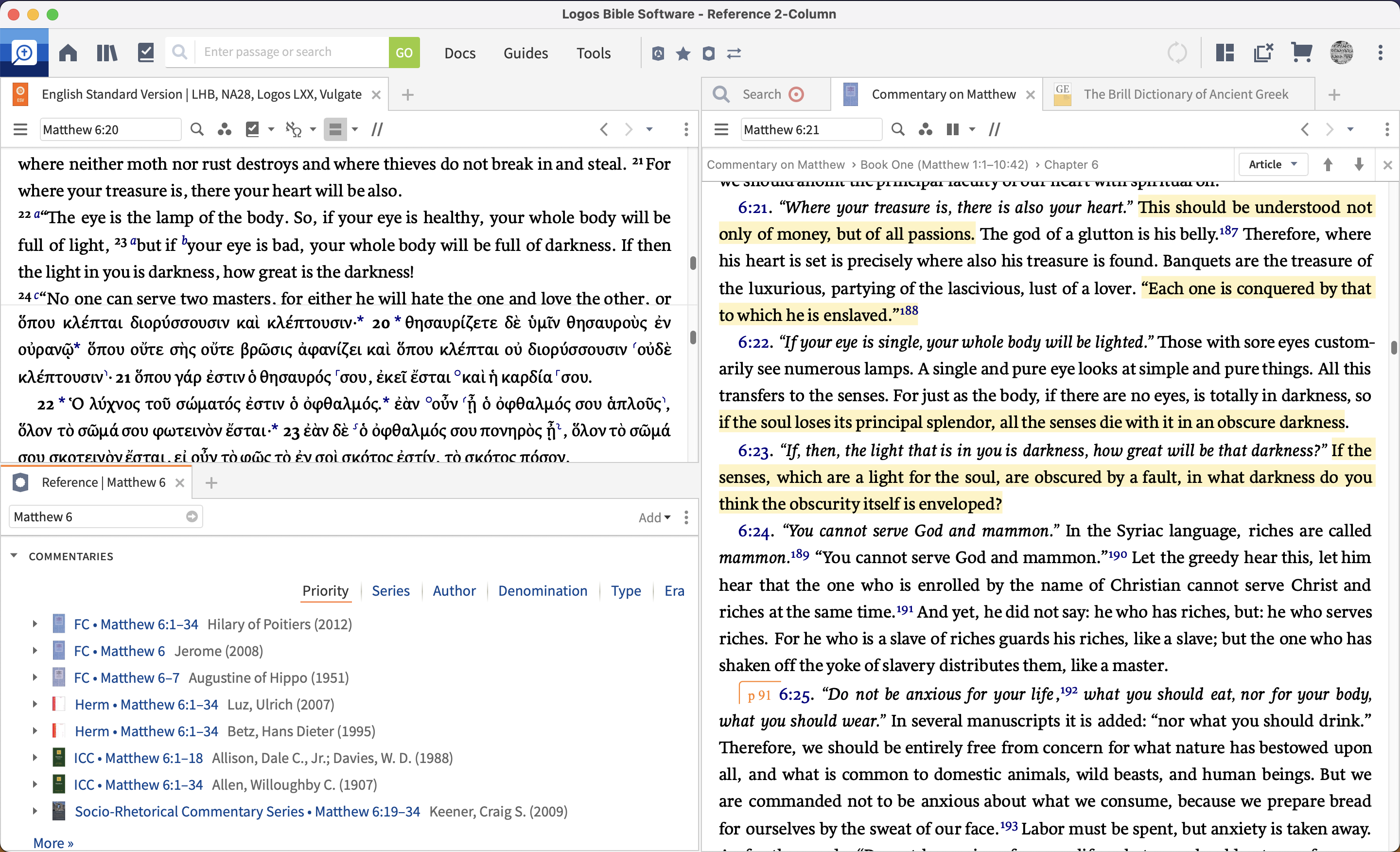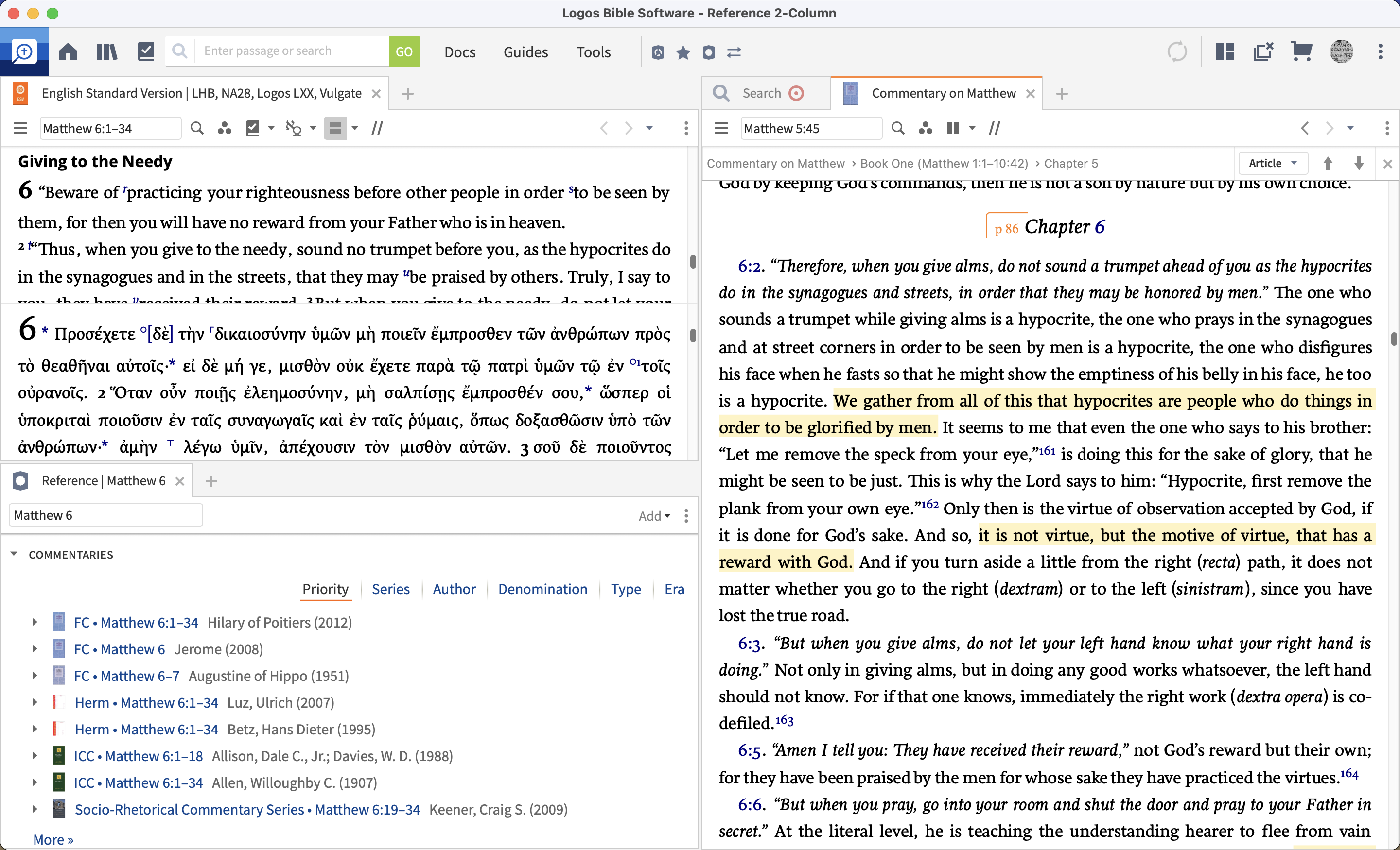 You can open a copy of your favorite bible alongside the passage guide and commentary. Here, I have the ESV and NA28 open using the multiple resources display, which we will come back to below.