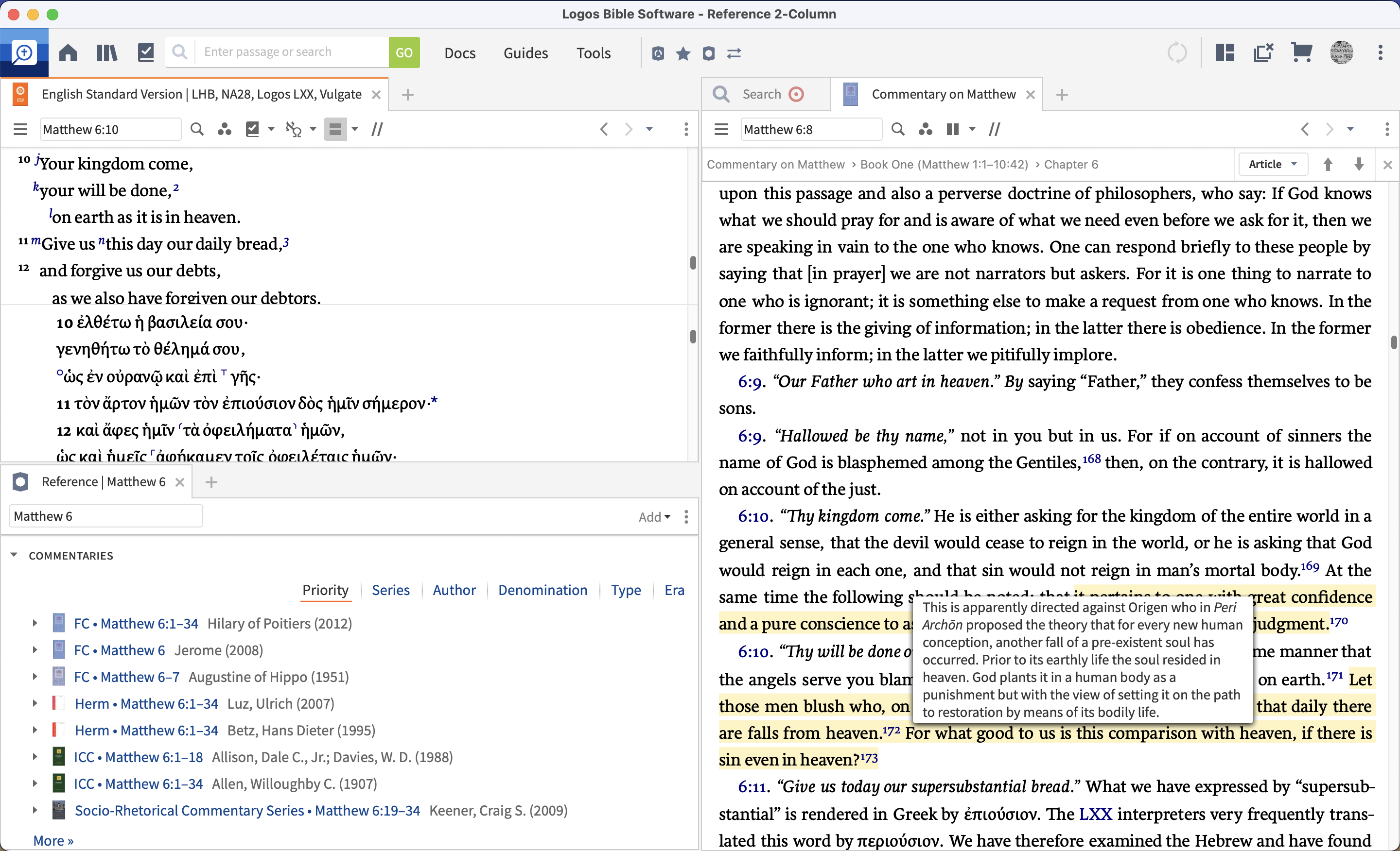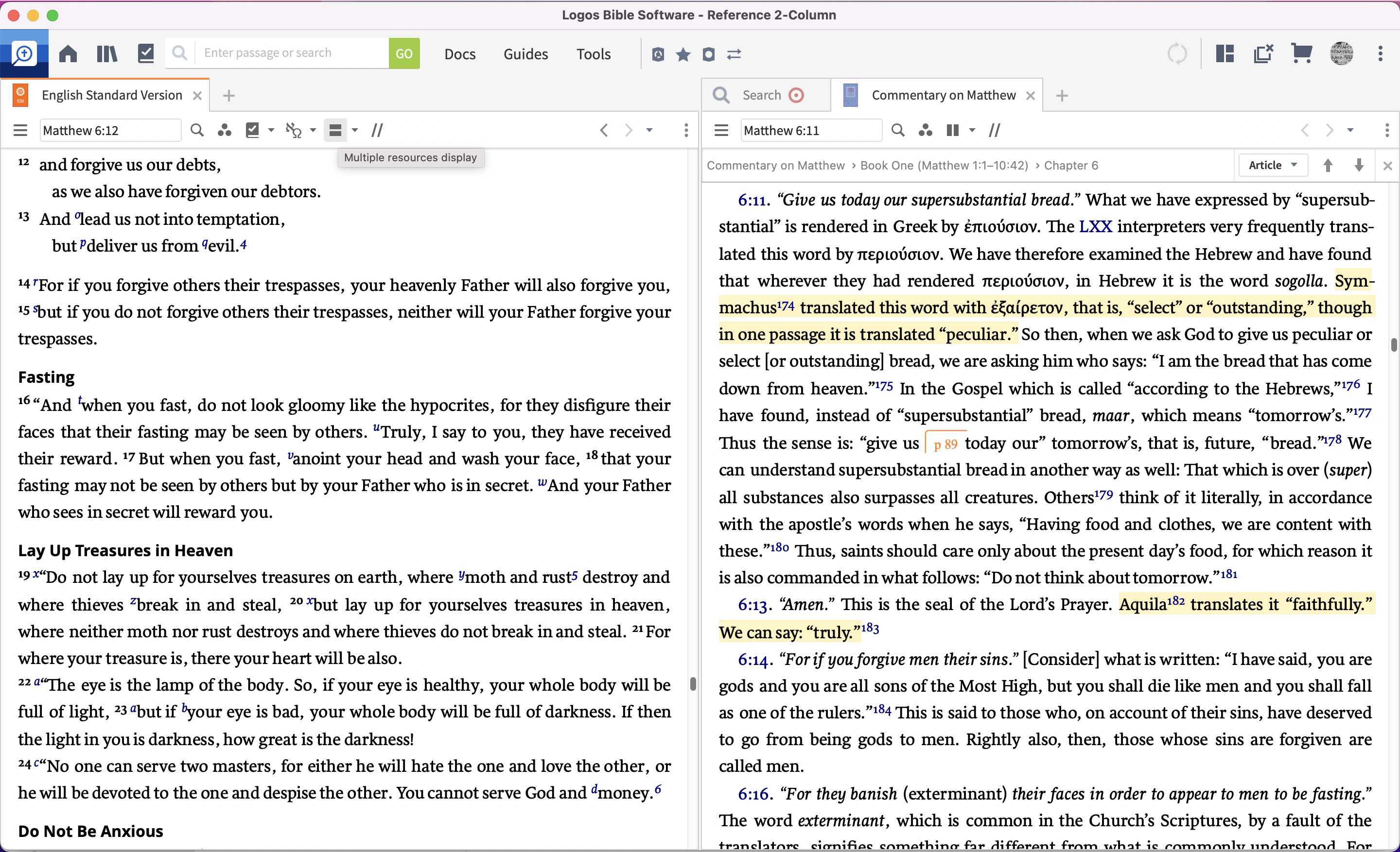 In his comments on Matthew 6:11, Jerome discusses a couple words that occur only once in the Latin and Greek Bible—supersubstantialis and ἐπούσιος. This is an instance when you might want to see the Latin, Greek, and English side-by-side, and it’s a great opportunity to demonstrate one of my favorite features of Logos. The multiple resources display is a feature unique to Logos giving you quick access to a completely customizable list of alternate versions in their fully tagged formats.