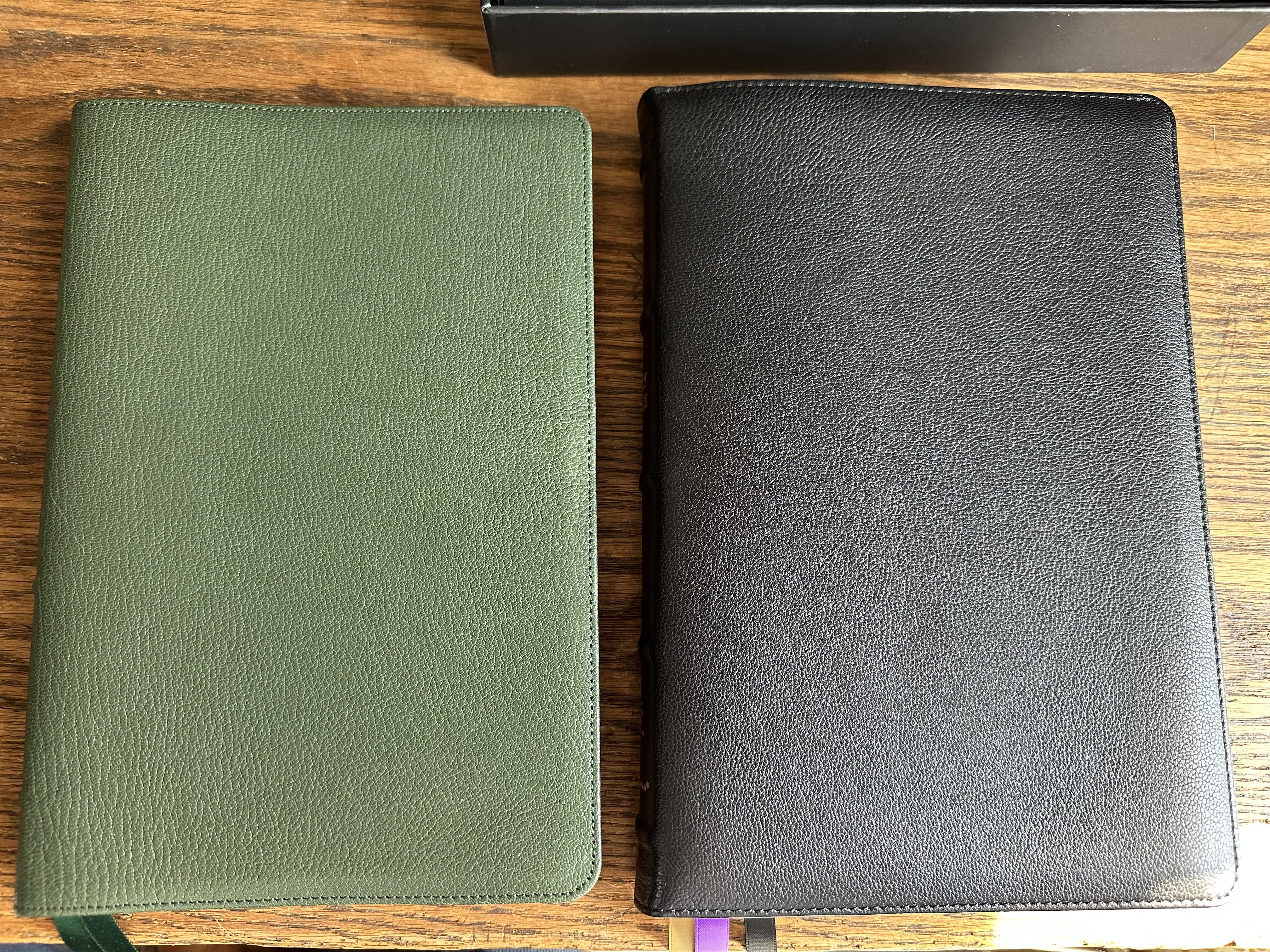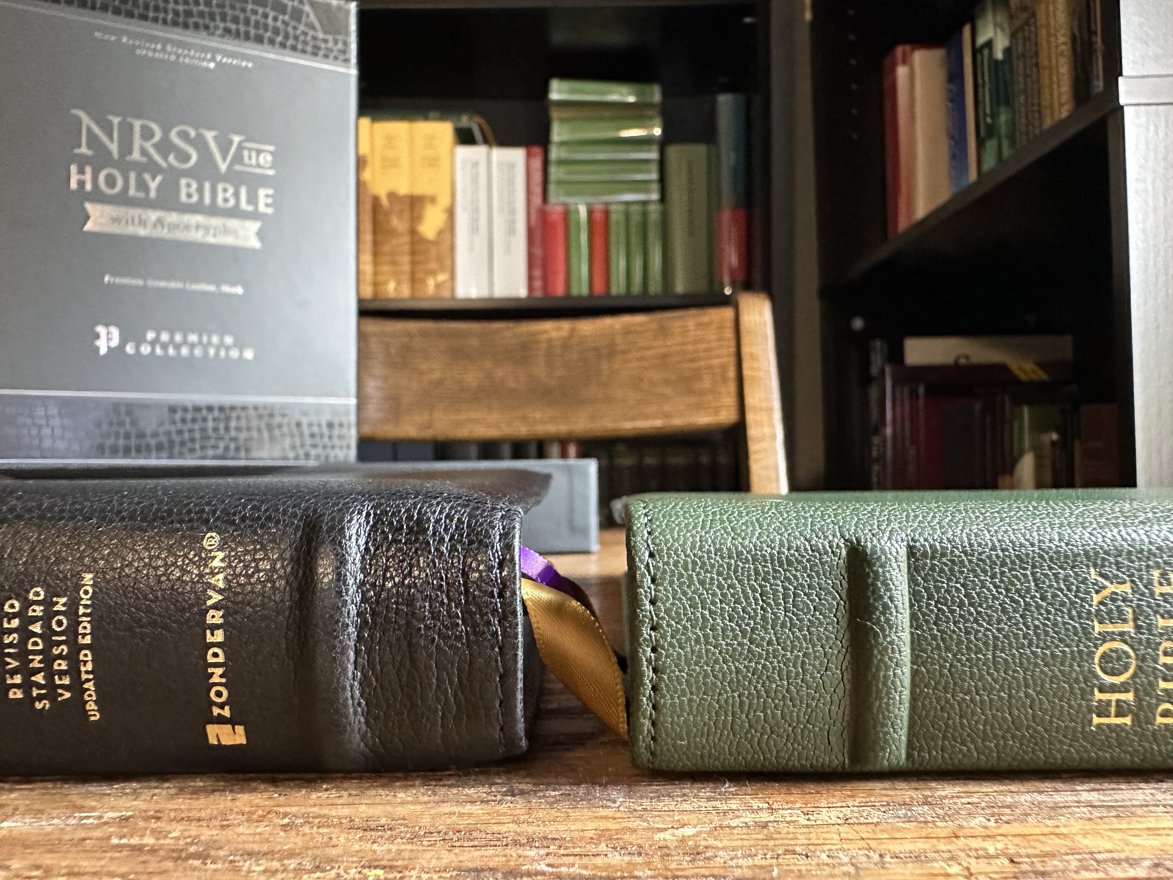 As you can see, the footprint of these footprint of these two Bibles is very similar. Because the NRSVue Premier Collection includes the Apocrypha, it is just a little thicker and heavier.