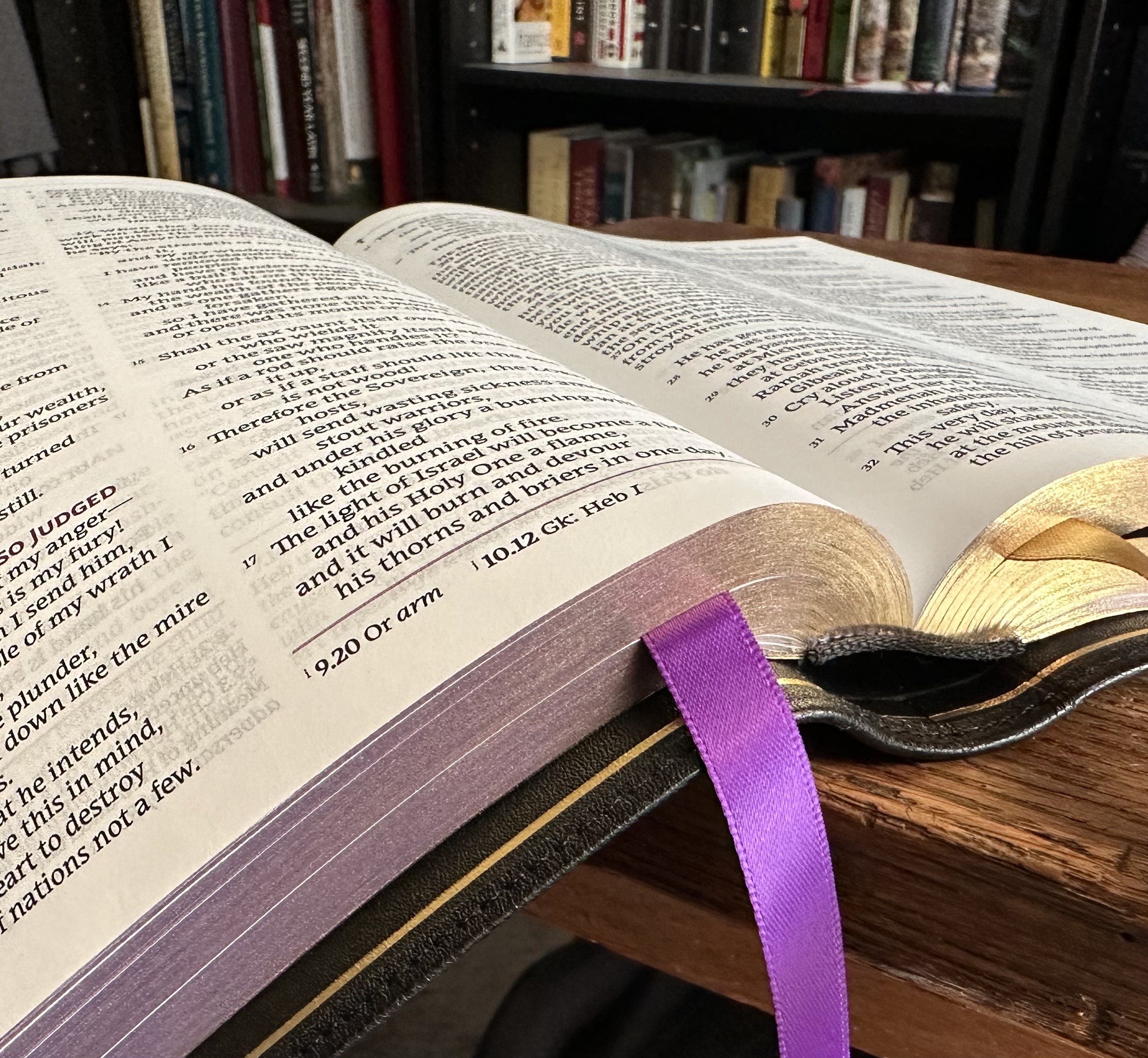 I highly recommend this Bible for a number of reasons: The 10-point, custom typeface is beautiful, bold, and easy to read. The goatskin cover is soft and durable. The raised spin hubs are a delight to the eye and feel great when holding the Bible with one hand. There is hardly any bleed through or ghosting on the pages, and the purple under gold art gilding gives the Bible a royal aesthetic fitting for Holy Scripture.