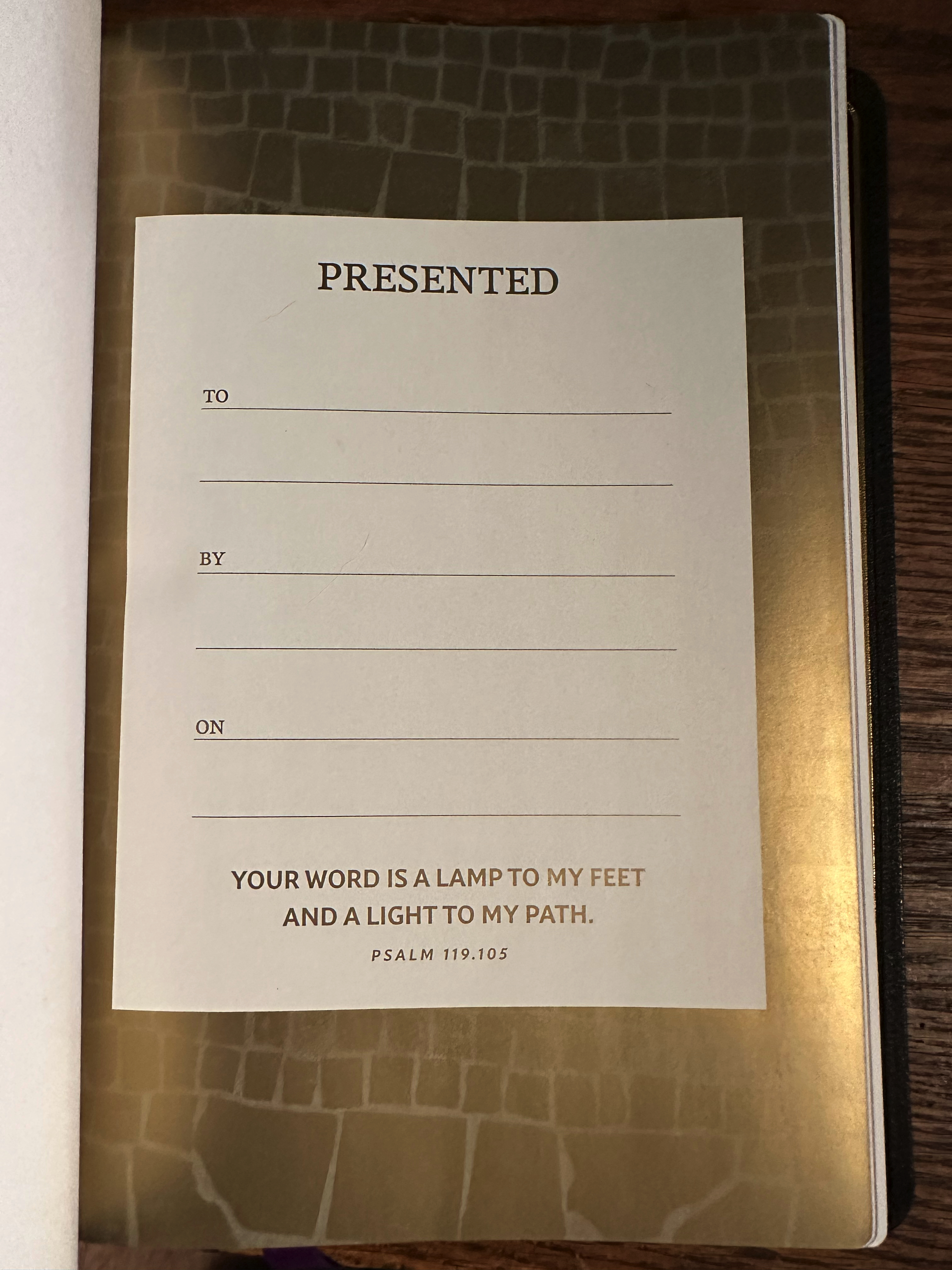 One minor quibble with the design: The presentation page is gaudy and just plain ugly. A Bible of this quality deserves something more minimal and refined in my opinion.