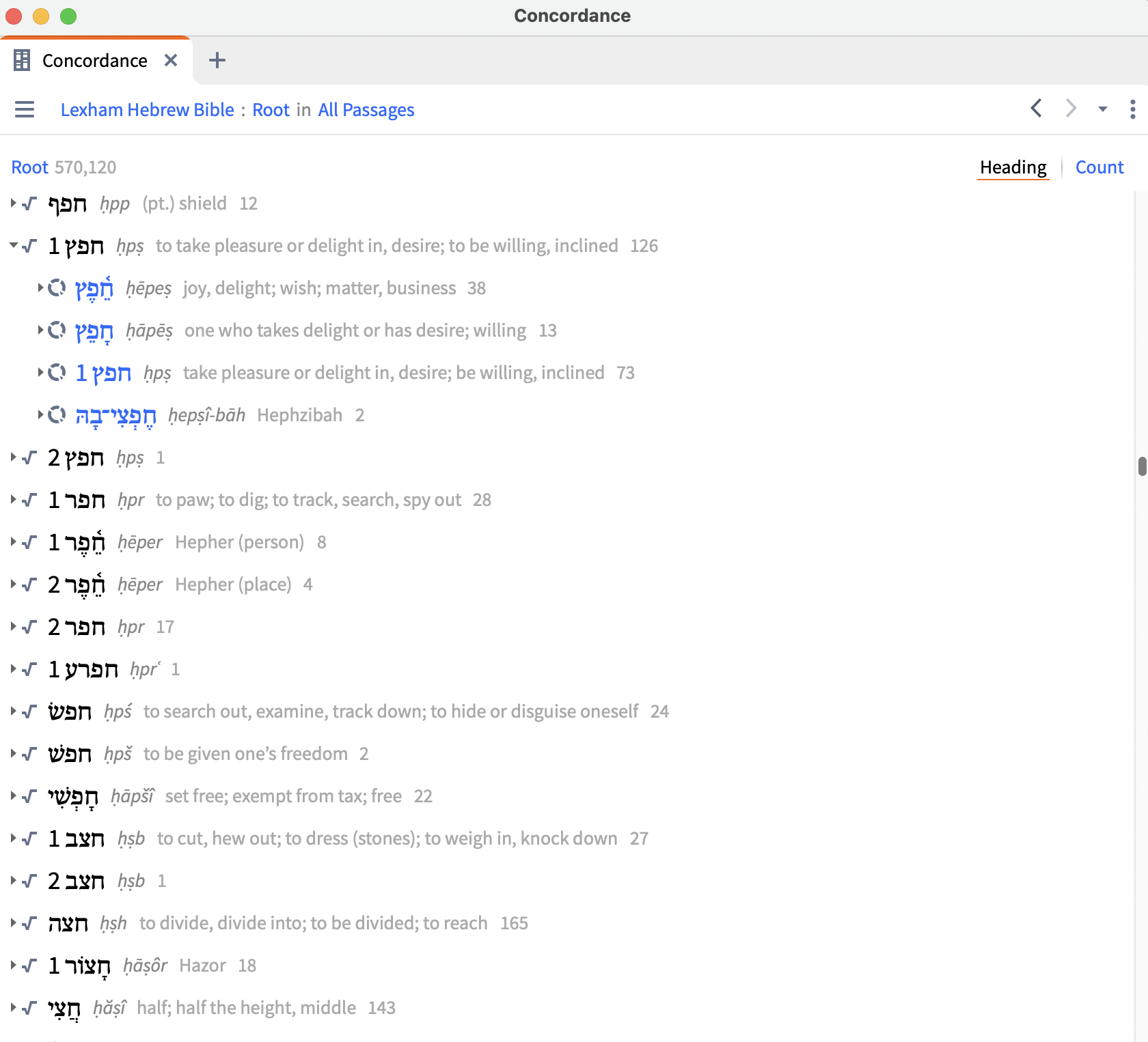 Today, I grabbed Lisowsky to check out the lexemes he organized under the root חפץ. I then opened the Logos Concordance Tool to compare. I set the database/book to the Lexham Hebrew Bible, I changed the settings to roots instead of lexemes, and this is what the report looks like: