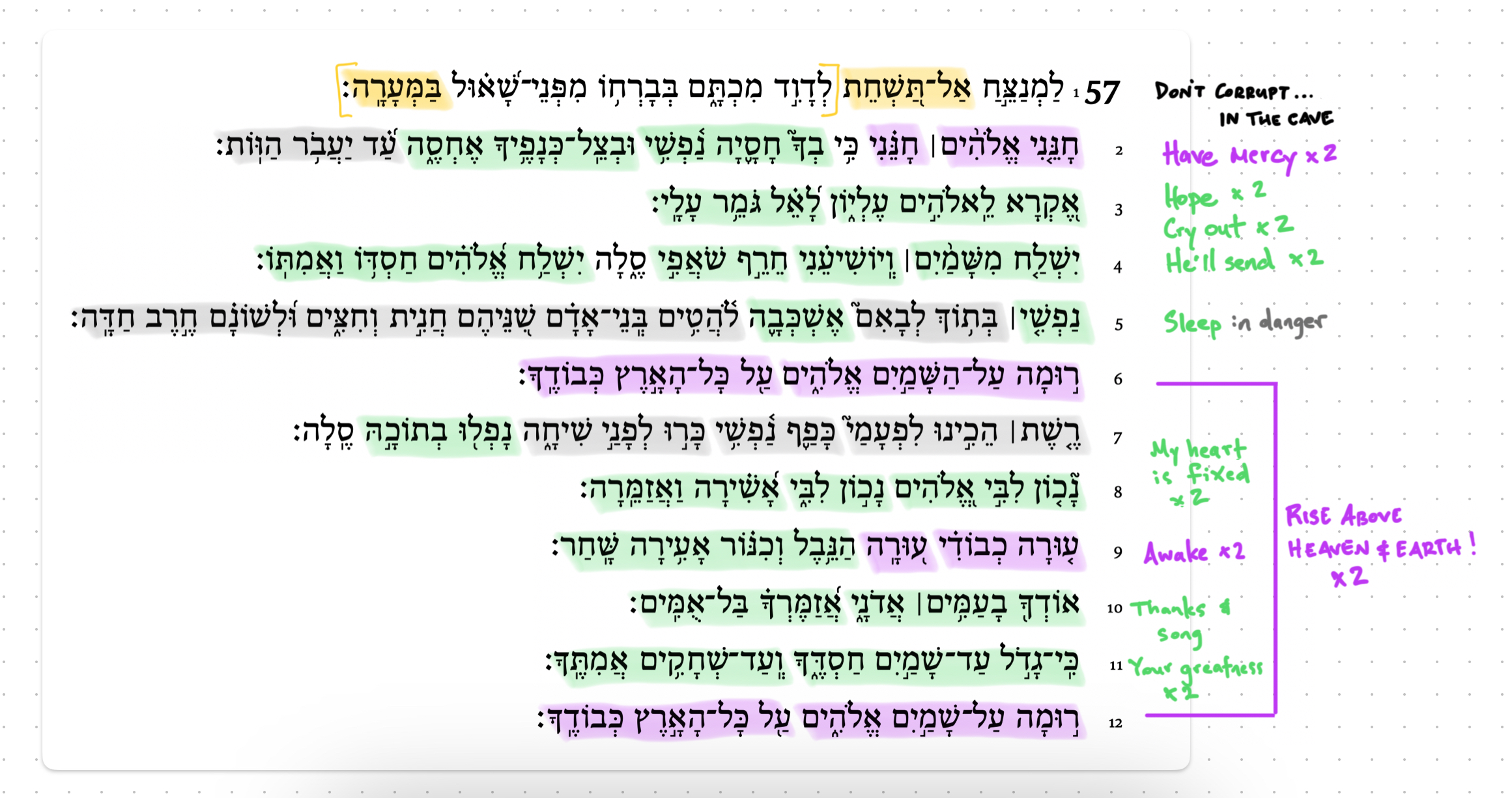 Psalm 57 then provides a script for how to think and talk to God during “cave days.” As a setting for a psalm, I take cave as a metaphor for the hardships of life. The psalm then becomes a script for hard times. It’s striking how this script is marked by an overwhelmingly hopeful tone. The mention of threats and persecution (grey) are surrounded by hopeful resolutions (green) and requests for help (purple).