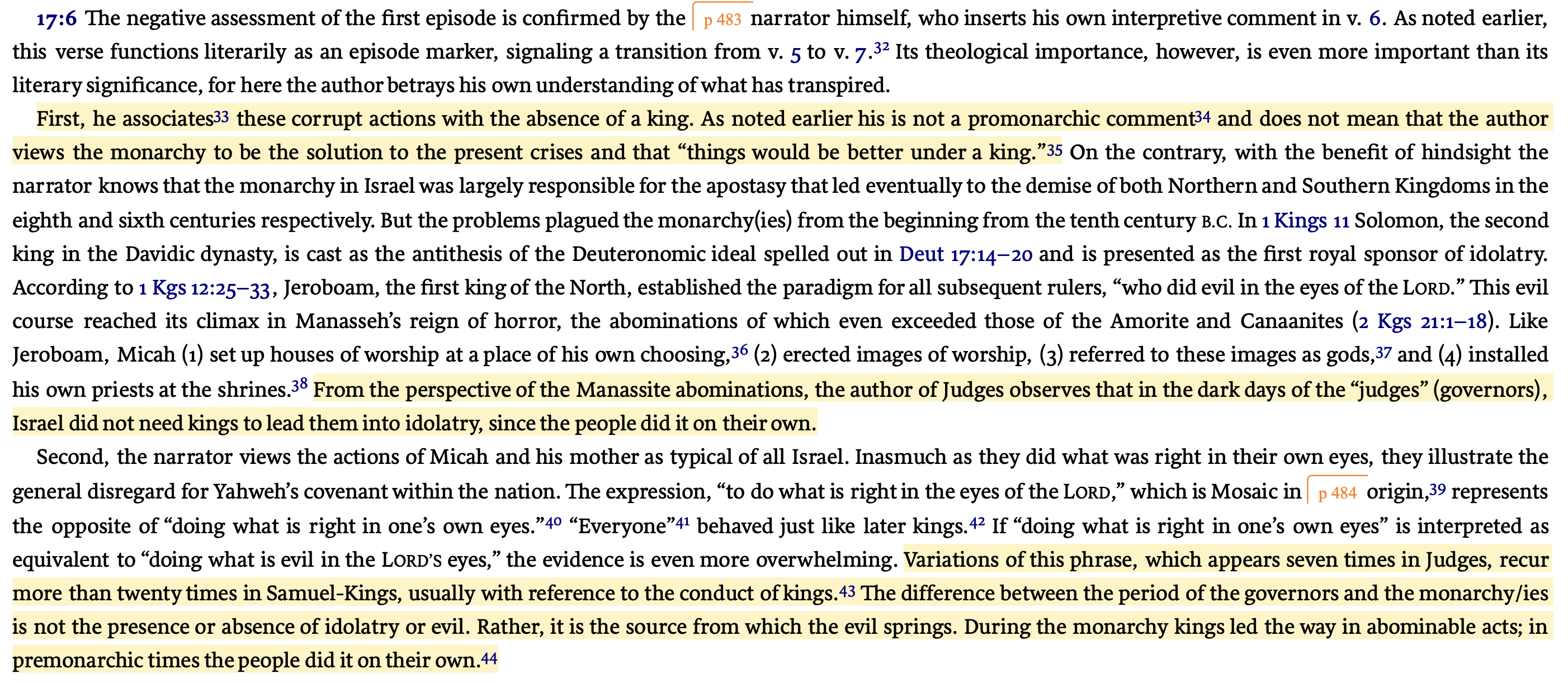 Block notes that the narrator is writing with a clear understanding of Israel’s history. The narrator knows that the kings will only lead to exile. Block observes that “doing what is right in your own eyes” versus “doing what is right in the eyes of Yahweh” comes from Deuteronomy (12:8, 25, 28). The kings of Israel are repeatedly denounced for acting just like the Judges generation. They all refuse to do what is right in the eyes of Yahweh (see the notes below), which is synonymous with doing what is right in your own eyes. Since the narrator knows that the kings are going to act just like the people in Judges, it wouldn’t make sense for him to be longing for the monarchy in Judges.