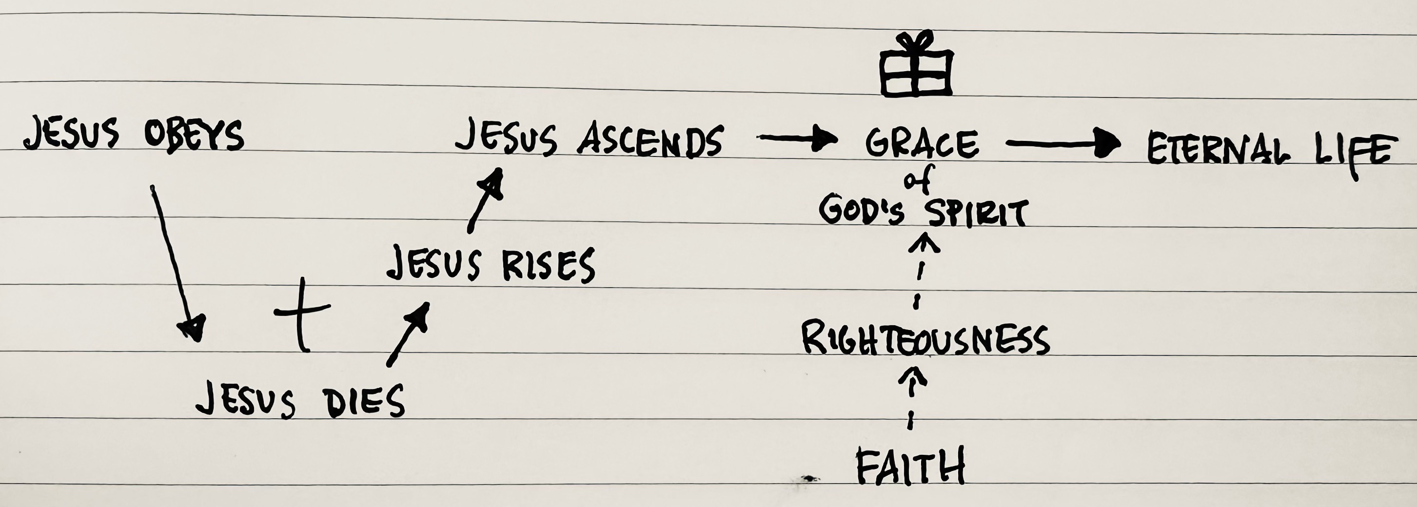 Through Jesus’s obedience, death, resurrection, and ascension, the gift of the Spirit is poured out, leading to life. We are united to the grace-gift of the Spirit through faith.
