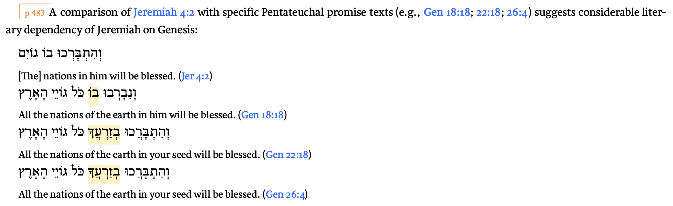 Sailhamer takes Jeremiah 4:2 as an early singular interpretation of the “seed” promise that runs throughout Genesis (Gen 18:18; 22:18; 26:4, going back to 12:3).